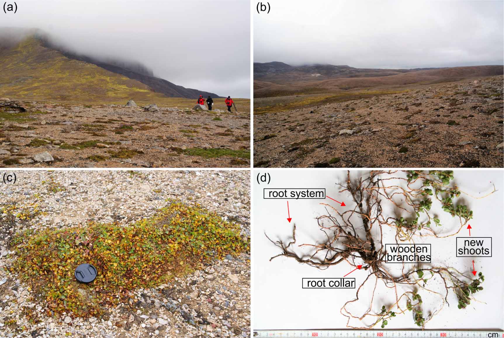 Standard image High-resolution imageFigure 2. General view of sampling sites with isolated polar willow mats at the southern foothills of Miseryfiellet and Skrekkjuvet cliffs in the south-eastern part of Bear Island, intense green indicates the presence of ornithogenic maritime tundra communities (a) and (b); the typical prostrate growth form of polar willow (c); example of polar willow with the basic parts taken to the laboratory analysis (d).