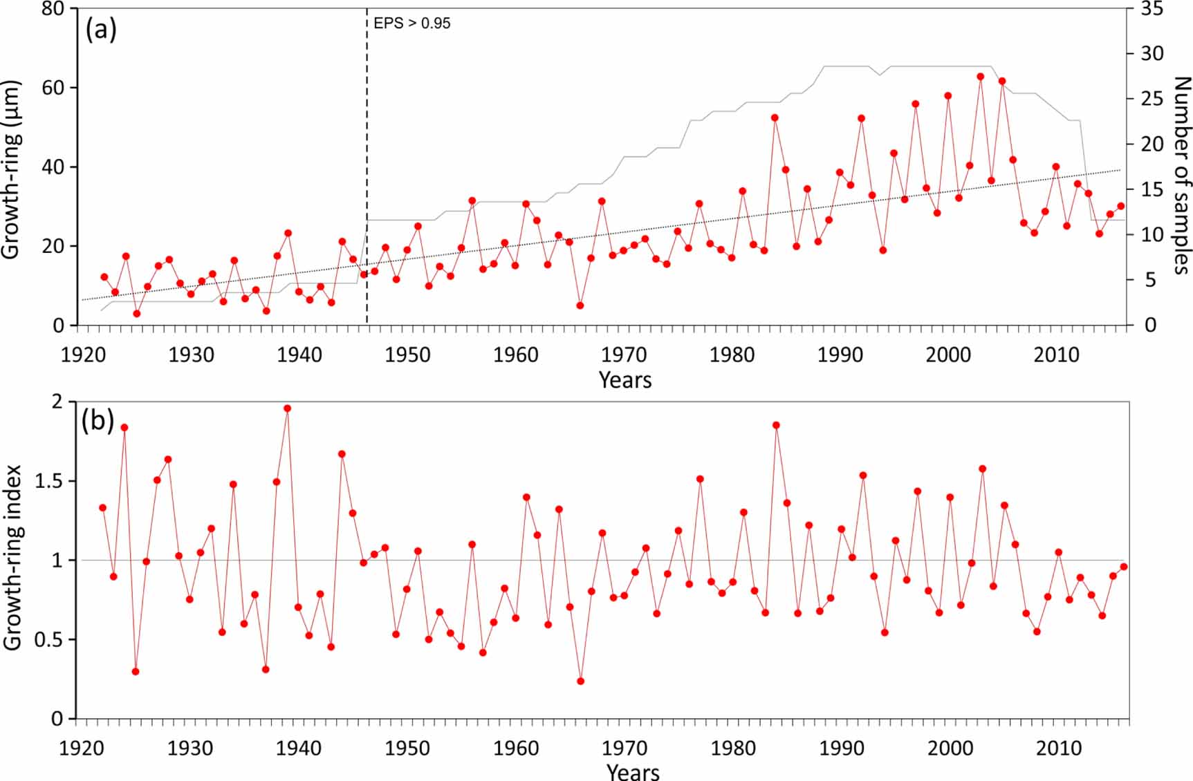 Figure 6. Raw (a) and indexed (b) ring-width chronologies of polar willow from Bear Island covering the years 1922–2016.