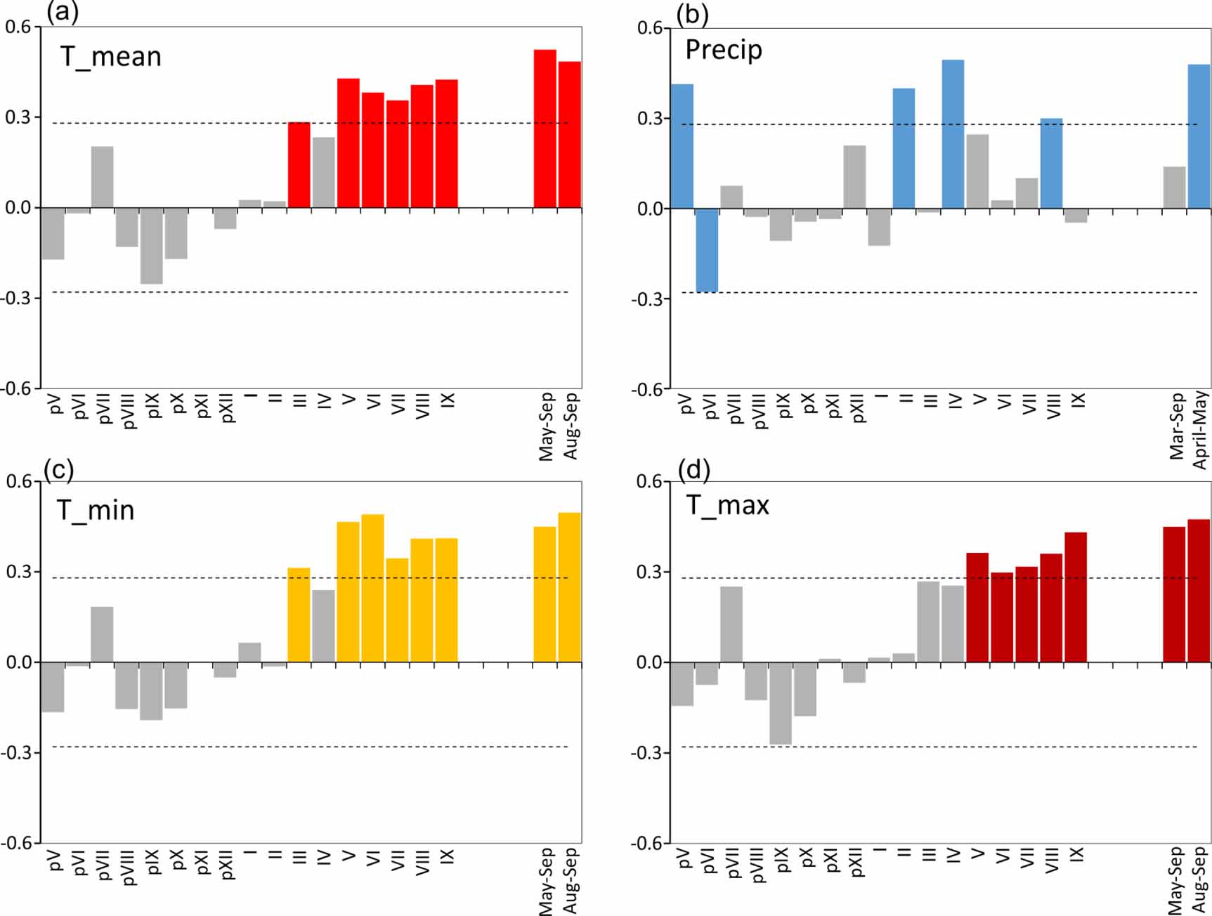 Figure 7. Correlation function analyses between polar willow chronology from the Bear Island and monthly (previous year May to current year September) mean temperature (a), monthly precipitation totals (b), minimum temperature (c) and maximum temperature (d) values for the period 1946–2016. Correlation coefficient values are shown in bars, and filled bars indicate statistically significant correlation (p < 0.05).