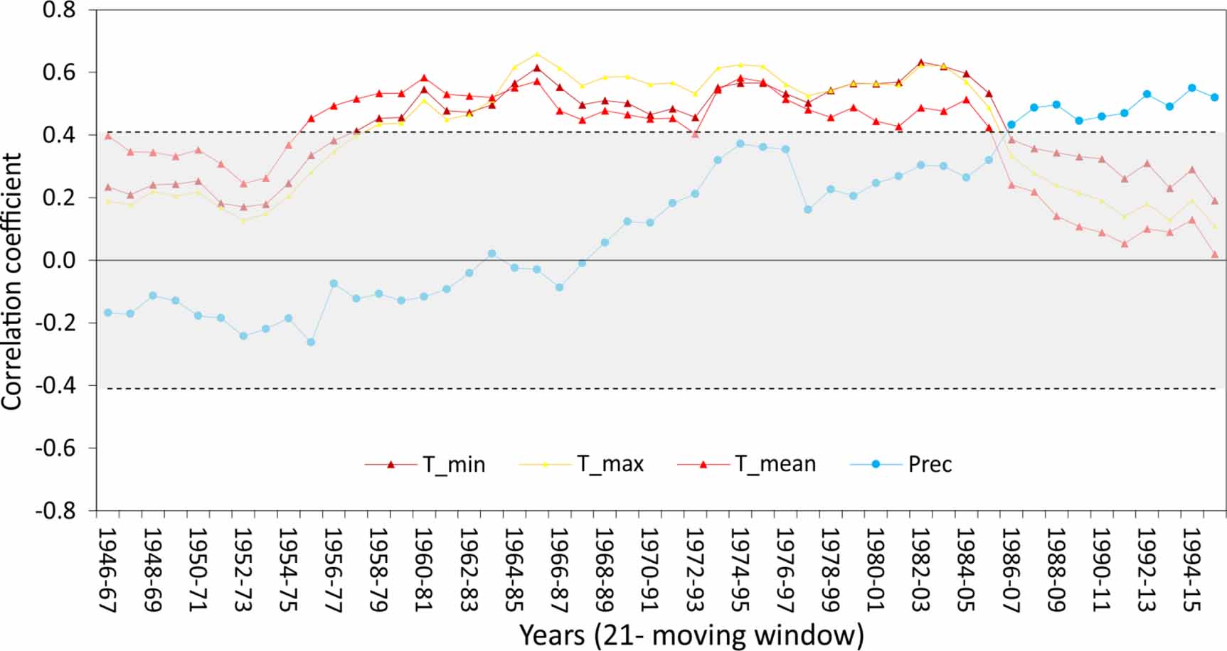 Figure 8. Moving correlation between growth-ring width of polar willow from Bear Island and climate variables (March–September): T minimum, T maximum, T mean and precipitation. Horizontal dotted lines indicate statistically significant correlation (p < 0.05).