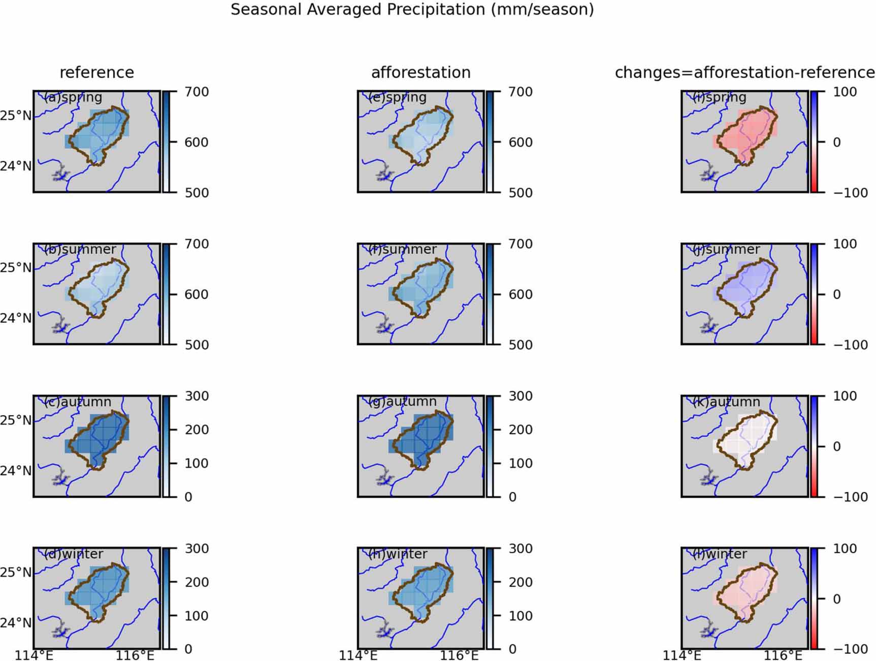 In figure 2, the left and middle series of panels show the spatial distribution of the seasonal averaged precipitation of the UDRB in the reference period and the afforestation period, respectively. The precipitation in spring (March–May) and summer (June–August) is much greater than that in autumn (September–November) and winter (December–February). The right panel in figure 2 presents the spatial distribution of changes in seasonal averaged precipitation from the reference period to the afforestation period. It clearly shows that precipitation in spring decreased notably, while precipitation in summer showed an obvious increase. In comparison, precipitation in autumn and winter did not change much. In figure 3, the upper and lower panel present the annual time series of precipitation and monthly averaged precipitation in the UDRB. The annual averaged precipitation was 1630 mm yr−1 in the reference period and 1614 mm yr−1 in the afforestation period, respectively. That means the annual averaged precipitation did not change much in the UDRB. When looking into the monthly scale, however, the intra-annual distribution of precipitation showed notable difference in these two periods. Specifically, the seasonal averaged precipitation in spring (March–May) decreased from 625 mm season−1 in the reference period to 582 mm season−1 in the afforestation period, while the seasonal averaged precipitation in summer (June–August) increased from 576 mm season−1 in the reference period to 645 mm season−1 in the afforestation period.