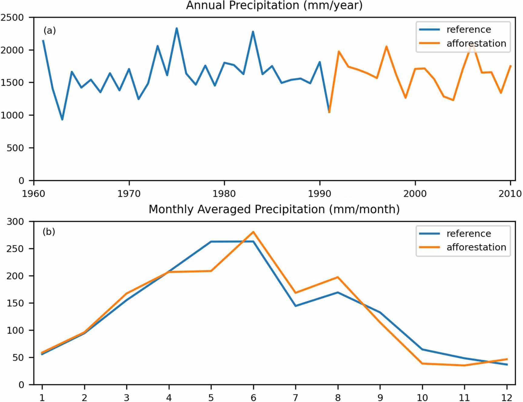 Standard image High-resolution imageFigure 3. (a) Annual precipitation time series during the study period (1961–2010); (b) monthly averaged precipitation in the reference period (1961–1990) and the afforestation period (1991–2010), respectively.