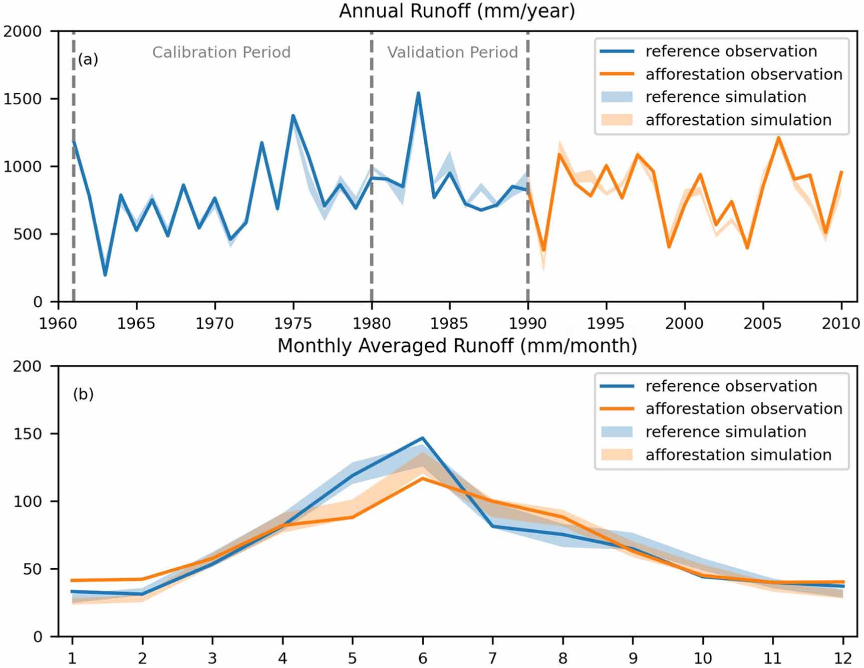 Figure 7. (a) Observed and simulated annual runoff time series during the study period (1961–2010); (b) observed and simulated monthly average runoff in the reference period (1961–1990) and the afforestation period (1991–2010), respectively.