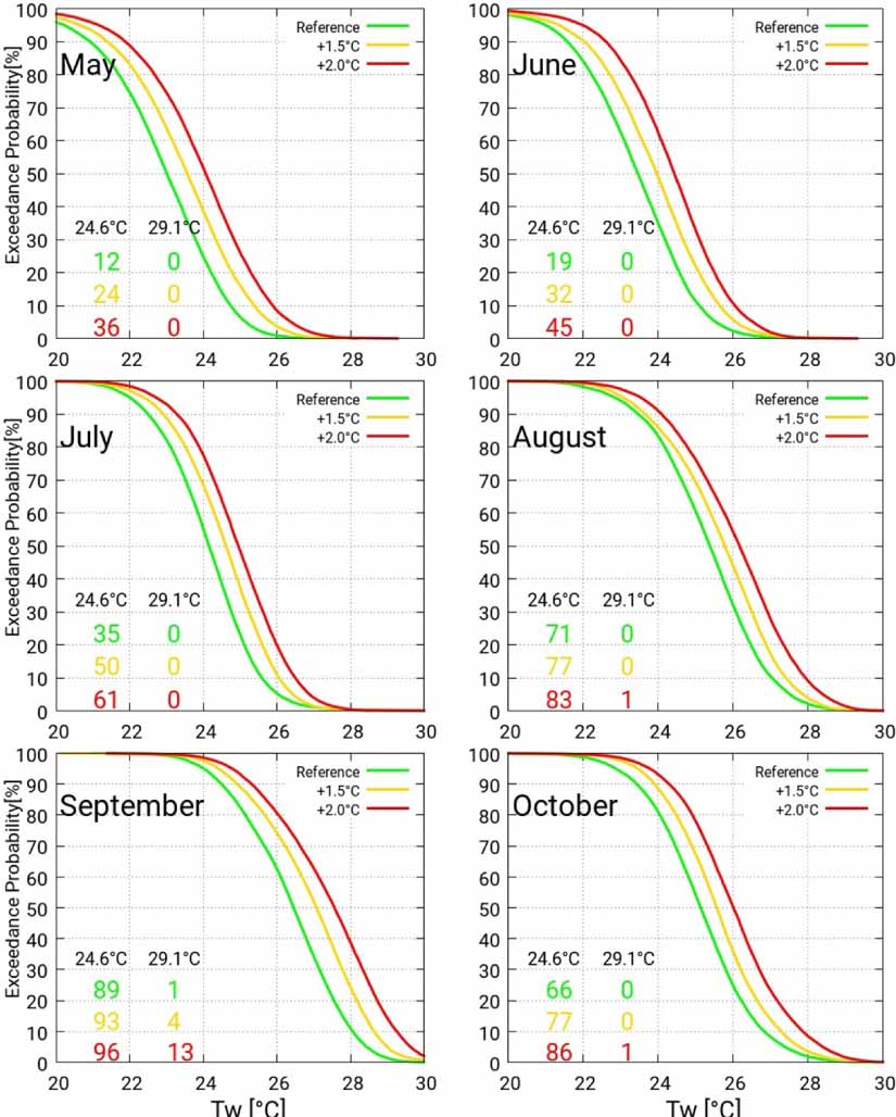 Similarly, the RR_P2030 for the highest TW for each month is in the range of approximately 10 for 2 °C, which is reduced to 5 in 1.5 °C warmer world. In the least warm month of May, the value of RR_P2030 goes as high as 14 at the TW value of 25.5 °C for the global warming of 2 °C. It is important to note that in order to have sufficient representation of exceedance probabilities for each TW limit, we applied a cutoff at the 98th percentile on the historical period for each month. Therefore, the extremely dangerous threshold does not appear in figure 6, however for August and September, TW values approach this threshold with twice as high risks at global warming level of 2 °C compared to 1.5 °C.