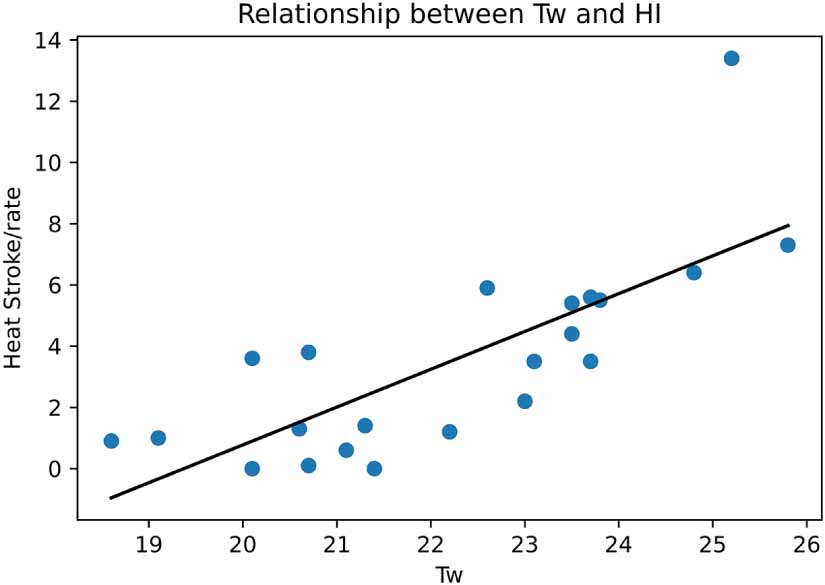 Standard image High-resolution imageFigure 5. Scatter plot between between heat stroke incidence rate (HI) and wet-bulb temperature (TW) for the period 1983–1988 based on the data obtained from (Noweir et al 2008).