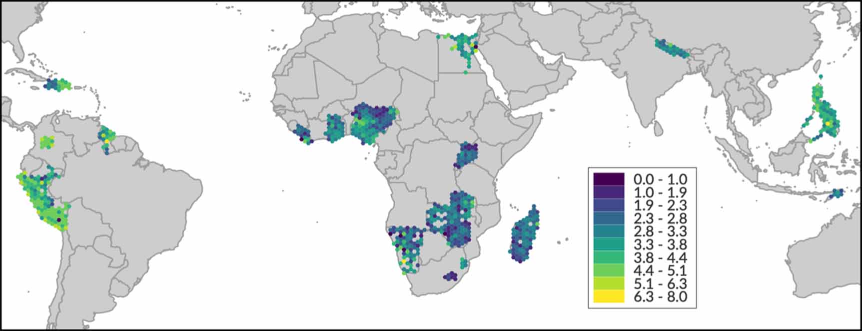 Figure 1. Child individual diet diversity score across 19 countries in the Demographic Health Surveys dataset. Color gradients indicate the number of food groups eaten by children in the household in the last 24 h prior to the survey. Among the surveyed countries, diet diversity is highest in South America and lowest in Southeast Africa.