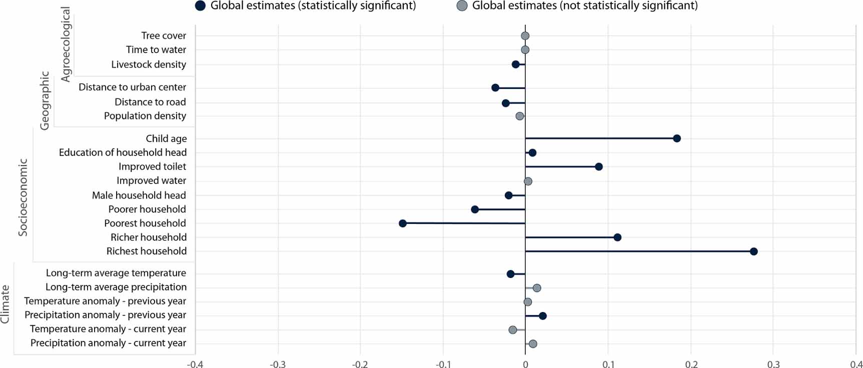 Figure 2. Standardized coefficient effects of different agroecological, geographic, socioeconomic, and climate factors on child diet diversity across 19 countries. Dark circles indicate statistically significant coefficients (p < 0.05); grey dots are insignificant. Lines drawn from 0 to a coefficient point are only to clearly highlight the varying level of effects. Points to the left of zero (negative coefficients) indicate the variable is associated with decreased diet diversity while those to the right of zero (positive coefficients) indicate the variable is associated with increased diet diversity. Full model estimates are found in SI appendix table S4.