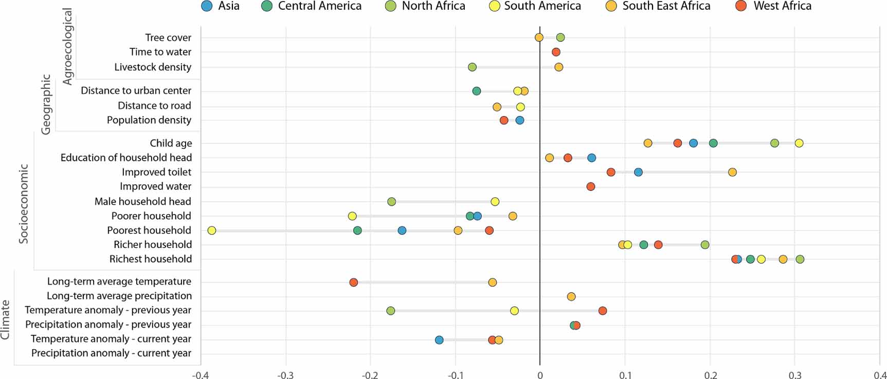 Figure 3. Significant standardized coefficients (p < 0.05) of different agroecological, geographic, socioeconomic, and climate factors on child diet diversity across 19 countries. Points indicate coefficients for each region, and only statistically significant coefficients are shown. Points to the left of zero (negative coefficients) indicate the variable is associated with decreased diet diversity while dots to the right of zero (positive coefficients) indicate the variable is associated with increased diet diversity in a given place. Underlying grey lines between coefficient plots indicate the full range of coefficients across all models. Full regional model results including non-significant coefficients appear in SI appendix tables S5–S10.