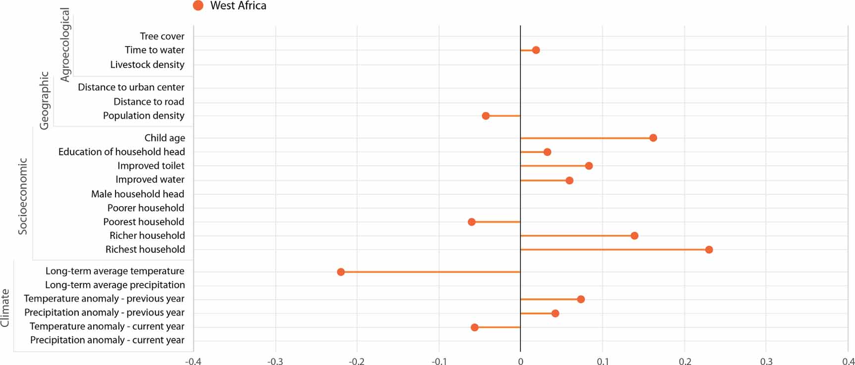 Figure 4. Significant standardized effects (p < 0.05) of different agroecological, geographic, socioeconomic, and climate factors on child diet diversity in West Africa. Results highlight the relatively-large effect of temperature on diet diversity as compared to other development efforts such as education, water, and sanitation interventions. Lines drawn from 0 to a coefficient point are only to clearly highlight the varying level of effects. Full regional West Africa model results appear in SI appendix table S10.