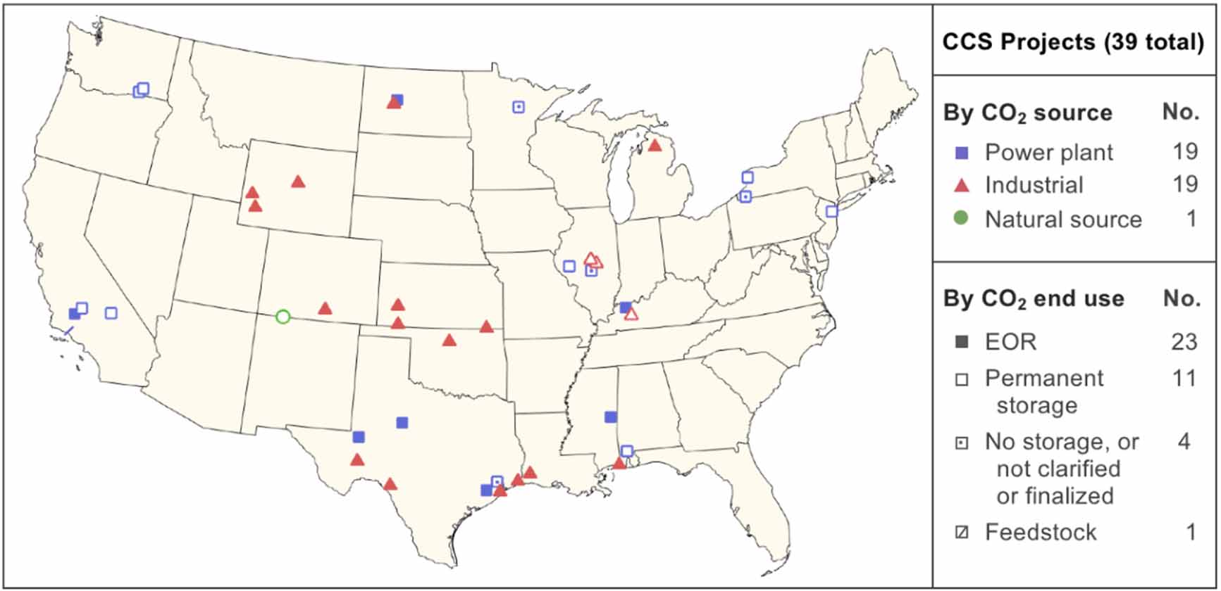 Figure 2. We review and score project attributes for 39 CCS projects proposed or built across the U.S. Across the 39, the applications and technologies employed are diverse and include demonstration, industrial, and power plant facilities. Twenty of 39 projects have been built; see table S-5 in SI file 1 for the complete list and figure S-3 in SI text for details on project outcomes.