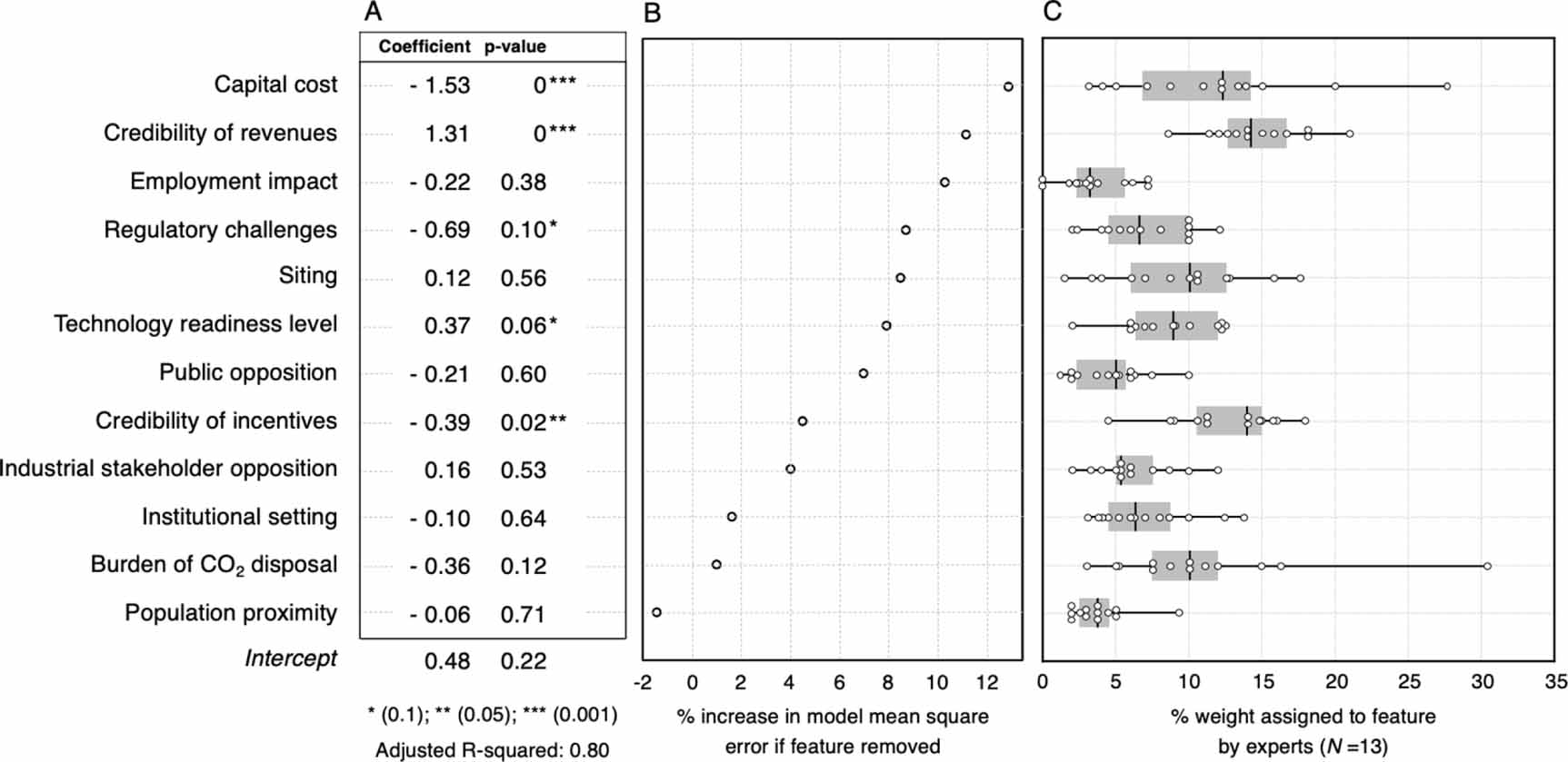 In figure 3, we employ both a linear regression model (figure 3(A)) and a random forest model (figure 3(B)) to identify functional relationships that map the 12 independent CCS project variables to the dependent variable—project outcome. The elicitation (figure 3(C)) produces a multi-criteria decision-making model that weights the relative causal importance of the same 12 variables. The order of variable importance across the three models is the core empirical result of this study.