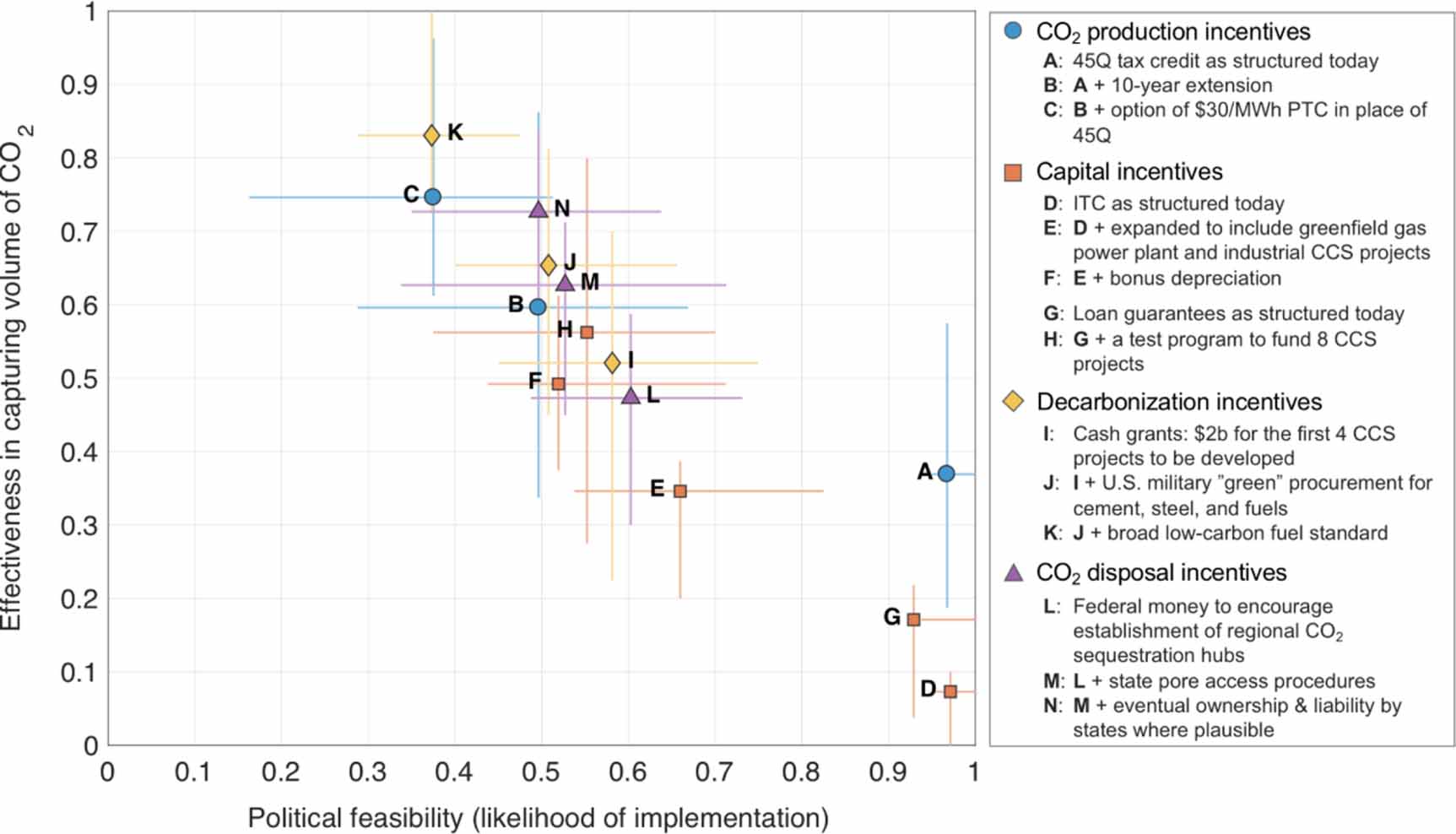Figure 4. Expert judgments of the effectiveness and political feasibility of four clusters of policy instruments that could enhance the viability of CCS projects. Clusters comprise CO2 production incentives, capital incentives, decarbonization incentives, and CO2 disposal incentives. Scores for feasibility and effectiveness are normalized by the policy package each expert deemed most feasible and effective in enabling large-scale CCS deployment by 2030, which are both scored 1. These need not be the same package. ITC is the investment tax credit. Markers denote means and bars interquartile ranges.