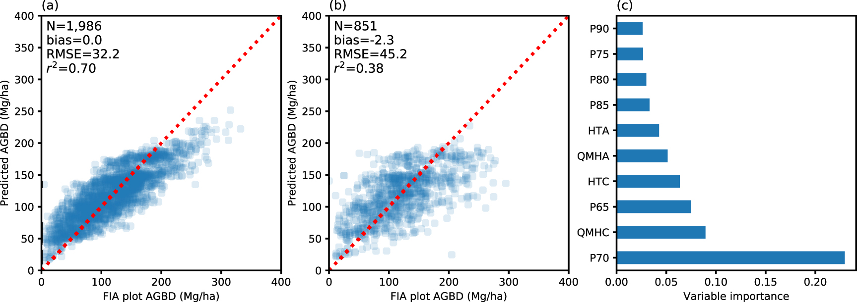 Figure 1. Comparison of Random Forest-model predicted and FIA-based biomass from the calibration dataset (a) (70% data) and validation dataset (b) (30% with-hold data). While P70 has the highest feature importance score in the model (c), it is highly correlated with some other canopy metrics (e.g. P90, mean height and quadratic mean height; figure S1). Multicollinearity and overfitting issues therefore drastically lower the prediction accuracy in the independent validation dataset.