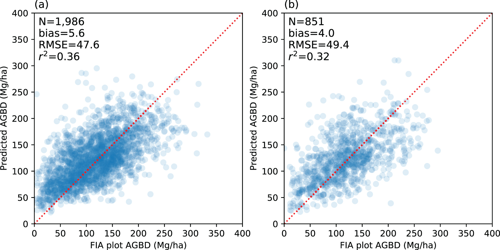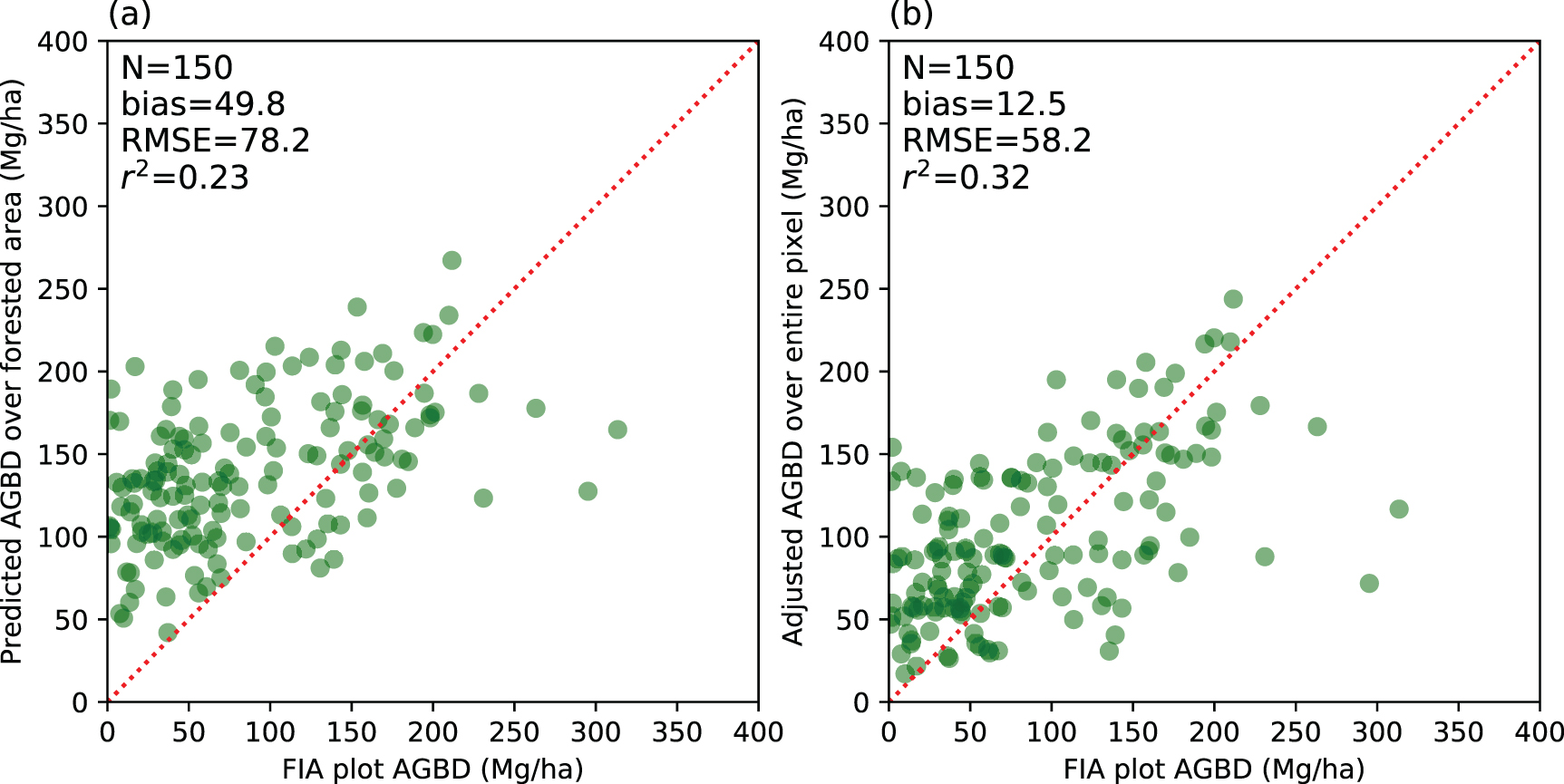 Figure 5. Comparison over developed urban area between model-predicted AGBD and all FIA plot-level estimates at 90 m resolution. Panel (a) shows a relative overestimation of our empirical lidar model because it does not account for the percentage of forest coverage in a pixel. An adjustment using canopy cover in panel (b) can partly correct this effect particularly at the low range (0–100 Mg ha−1).