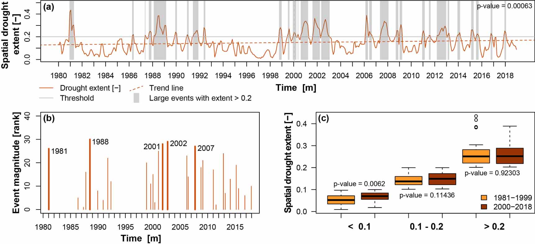 To evaluate changes in the monthly time series of drought spatial extent, we apply the non-parametric Mann–Kendall test (Mann 1945). In addition, we compare the distributions of drought spatial extent for the two periods 1981–1999 and 2000–2018 for the three value ranges