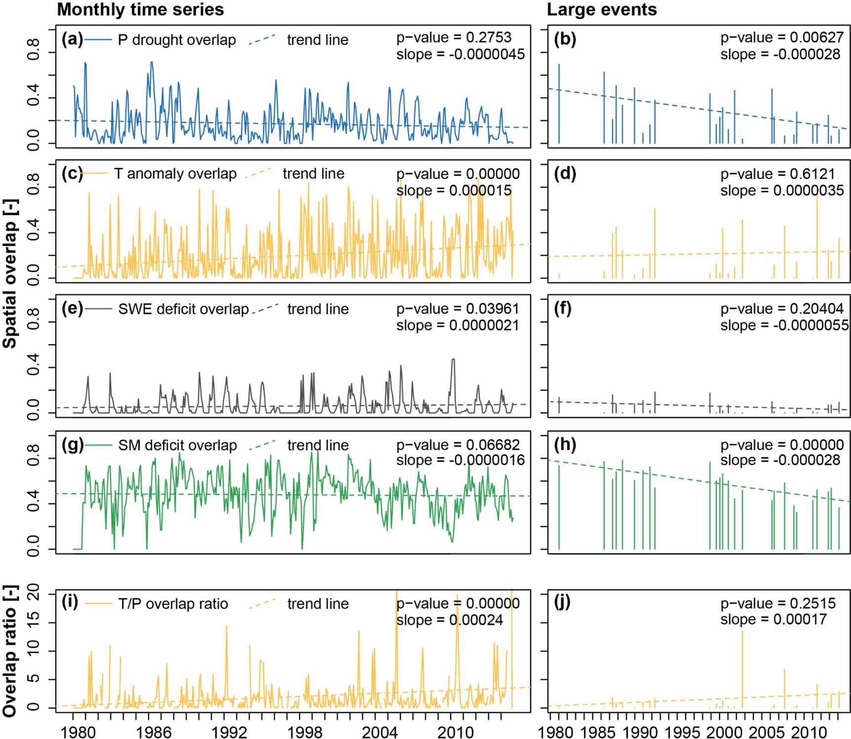 Figure 4. Temporal changes in hydro-meteorologic contributor overlap with spatial drought extent. Monthly spatial overlap of catchments affected by a streamflow drought (left panel) with catchments affected by (a) precipitation droughts, (c) temperature anomalies, (e) SWE deficits, and (g) soil moisture deficits and (i) monthly overlap ratios for T/P. Spatial overlap of catchments affected by a large streamflow drought event (extent