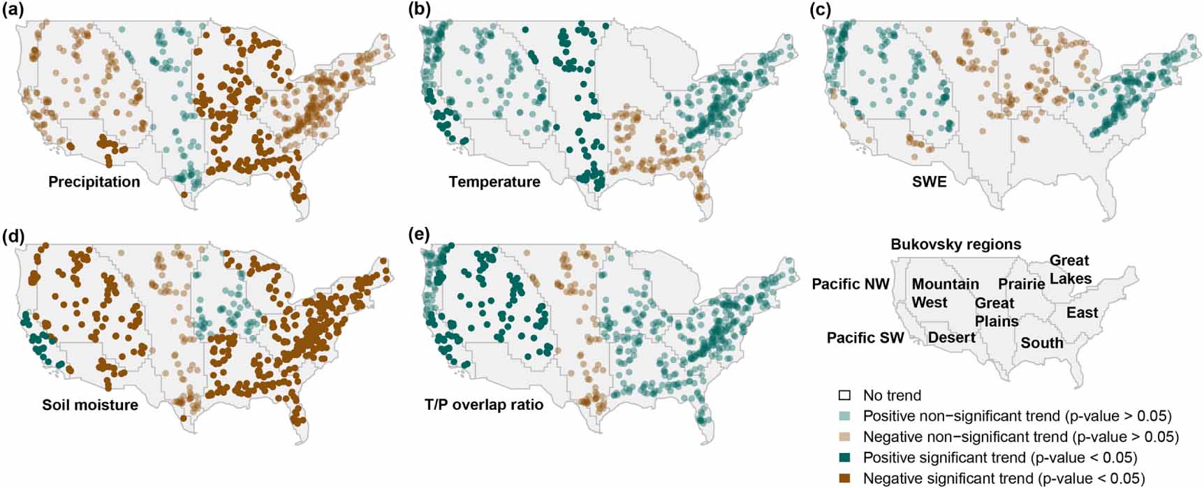 Standard image High-resolution imageTrend analyses for the nine climatic regions reveal substantial regional differences in the monthly overlap time series for the different hydro-meteorologic contributors (figure 5). Precipitation overlap decreases over most regions except the Great Plains (figure 5(a)), while temperature overlap increases in most regions except for portions of the southeast (figure 5(b))—resulting in an overall increase of the importance of temperature relative to precipitation (increase in T/P overlap ratio in all regions except the Great Plains, figure 5(e)). The increase of the importance of temperature relative to precipitation is especially pronounced across the inter-mountain west and Pacific Southwest but is also strong across the eastern US. Changes in SWE deficit overlap are mostly small except in the Pacific Northwest, where we note a substantial increase in SWE deficit overlap with drought spatial extent (figure 5(c)). Finally, the importance of soil moisture as an explanatory variable for drought extent decreases in most regions, with the strongest decreases found across the eastern US (figure 5(d)).