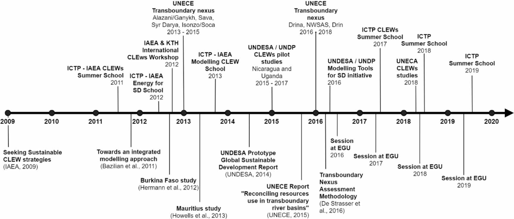 Figure 1. CLEWs timeline of selected institutional activities and initiatives in the period 2009–2019.
