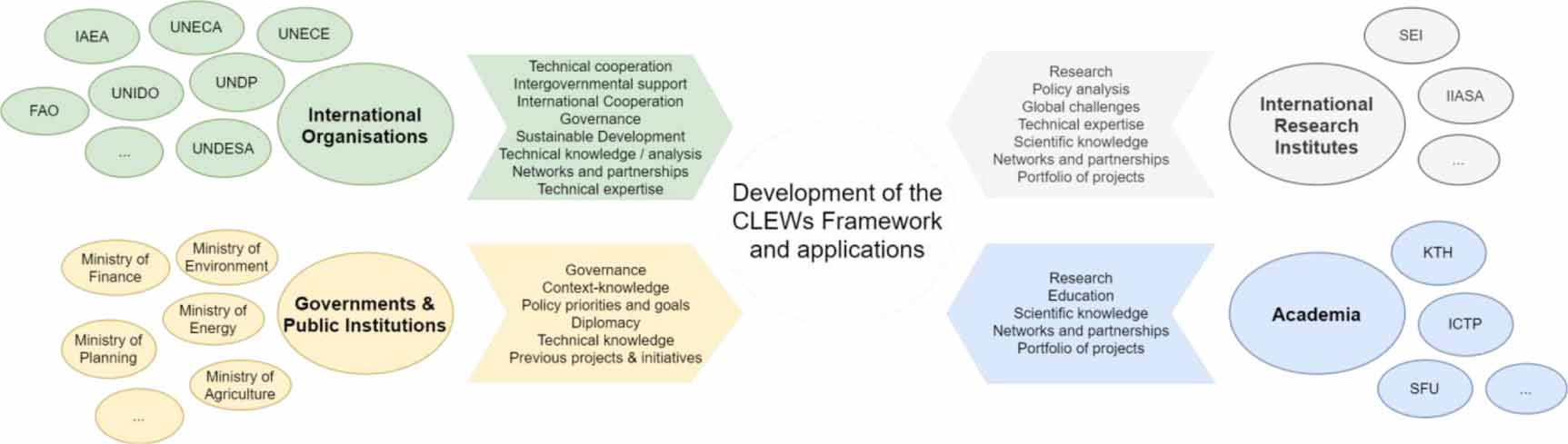 International institutions have been instrumental in the promotion and implementation of the CLEWs framework. Its advancement has been supported by the collaboration with research institutions driven by expanding scientific knowledge. The impact and relevance of the approach have been assessed, framed and tested at the policy level by governments taking part in the initiatives. However, much is still do be done to consolidate the integrated systems approach in the planning process. In figure 2, we provide an overview of the different expertise drawn by different institutions to the development of the CLEWs framework and of its applications. Depending on the type of institution, its field of work, mission and practices, particular expertise can be directly or indirectly deployed during the planning and development of an integrated assessment. Collaborations can be forged upon the understanding of what type of contribution each institution can give. These synergistic collaborations will determine the success of the assessment [97].