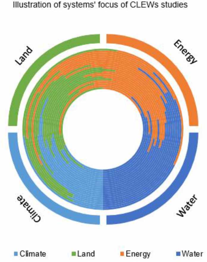 Figure 5. Coverage of the CLEW systems in the studies reviewed: (a) illustration of systems' focus of CLEWs studies.