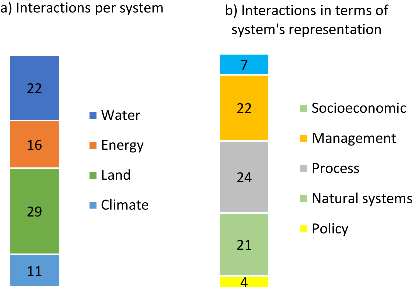 Standard image High-resolution imageBy examining the interlinkages represented, we can understand how the coverage of the CLEWs nexus was achieved. Interactions have been categorised in the literature in the context of the SDGs. The International Science Council [124, 125] classified SDGs interactions in terms of directionality, and on their dependencies in relation to context, governance, technology and time-frame. Also, in the context of the SDGs, McCollum et al [126] examine the literature for evidence of interactions between the SDGs and energy-related links. In the aforementioned study, interactions are classified in terms of synergies, trade-offs and linkages. In the context of the nexus of resource systems, Flammini et al [11] propose the elaboration of interlinkages matrices for the assessment of systems' linkages in terms of synergies and trade-offs. The matrices consider interactions between two of the WEF systems. This type of approach could assist the mapping of interactions identified in phase 2 of the CLEWs framework. Laspidou et al [127] make the distinction between direct and indirect interlinkages in the context of the nexus of water–energy–food–land–climate. Direct interlinkages correspond to unidirectional system-to-system interactions and are defined as first-order interlinkages. In contrast, indirect interlinkages correspond to interactions which propagate through different systems, involving more than two nexus dimensions (e.g. land–water–energy) [127]. In this study, interactions were classified in three ways: (a) in terms of the system of reference (i.e. of climate, land, water or energy); (b) in terms of systems involved (or directionality) (i.e. system-to-system interaction, e.g. climate → land); and, (c) in terms of their role in the representation of a system, using the categories: policy, process, natural systems, management and socioeconomics. The distribution of all identified interactions, according to the aforementioned categories, are shown in figures 6 and 7, respectively.