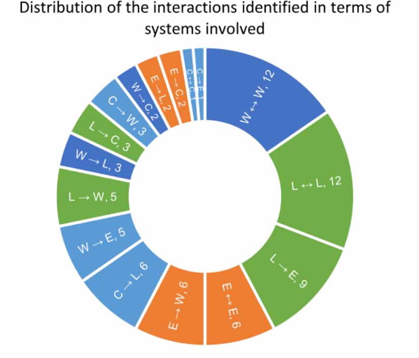 The national studies show the highest number of unique interactions and more balanced spread across systems (see figure 10) if we account for some of the interactions in the land systems being related to the water cycle. Close to 70% of the interactions correspond to interlinkages. Water and land are the systems which contain most intralinkages.