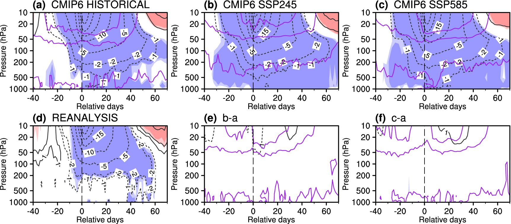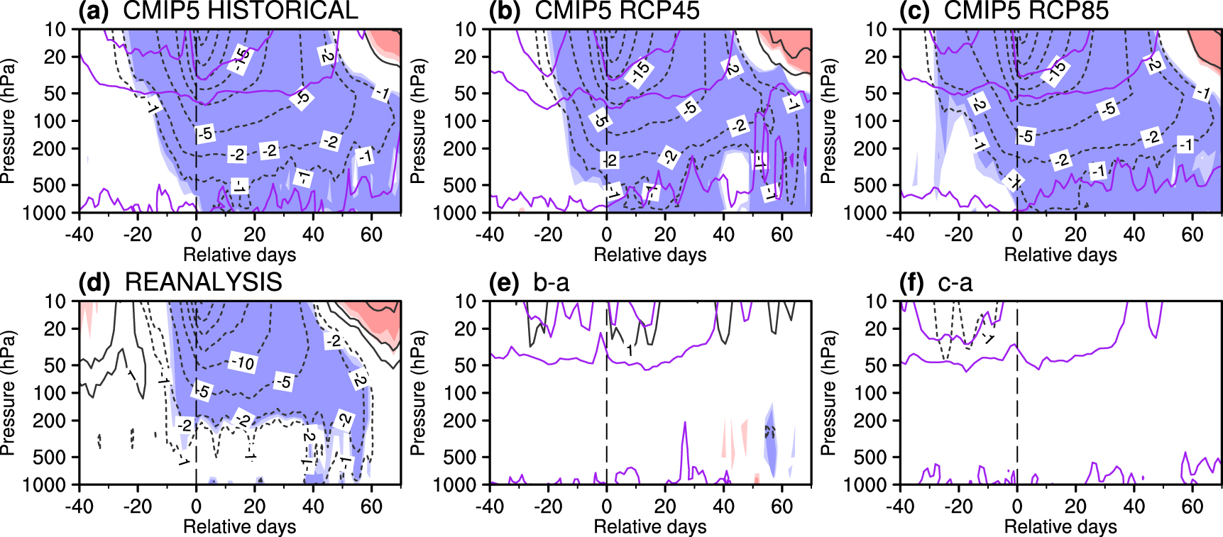 Figure 3. Composite evolutions of SSWs from day −40 to day 70 relative to the onset date of SSWs in (a) the historical simulation, (b) the RCP45 simulation, and (c) the RCP85 simulation. The reanalysis in (d) is shown as a reference for the evolution of SSWs in the present-day climate system. Projected changes of the evolution of SSWs in (e) RCP45 and (f) RCP85 with respect to the historical simulation is shown in the last two plots. Contours are the zonal-mean zonal wind anomalies at 60° N from 1000 to 10 hPa, and light and dark shadings mark anomalies at the 90% and 95% confidence levels, respectively. All plots show the CMIP5 MME. The purple contours show the inter-model standard deviation of the wind anomalies or differences if applicable.