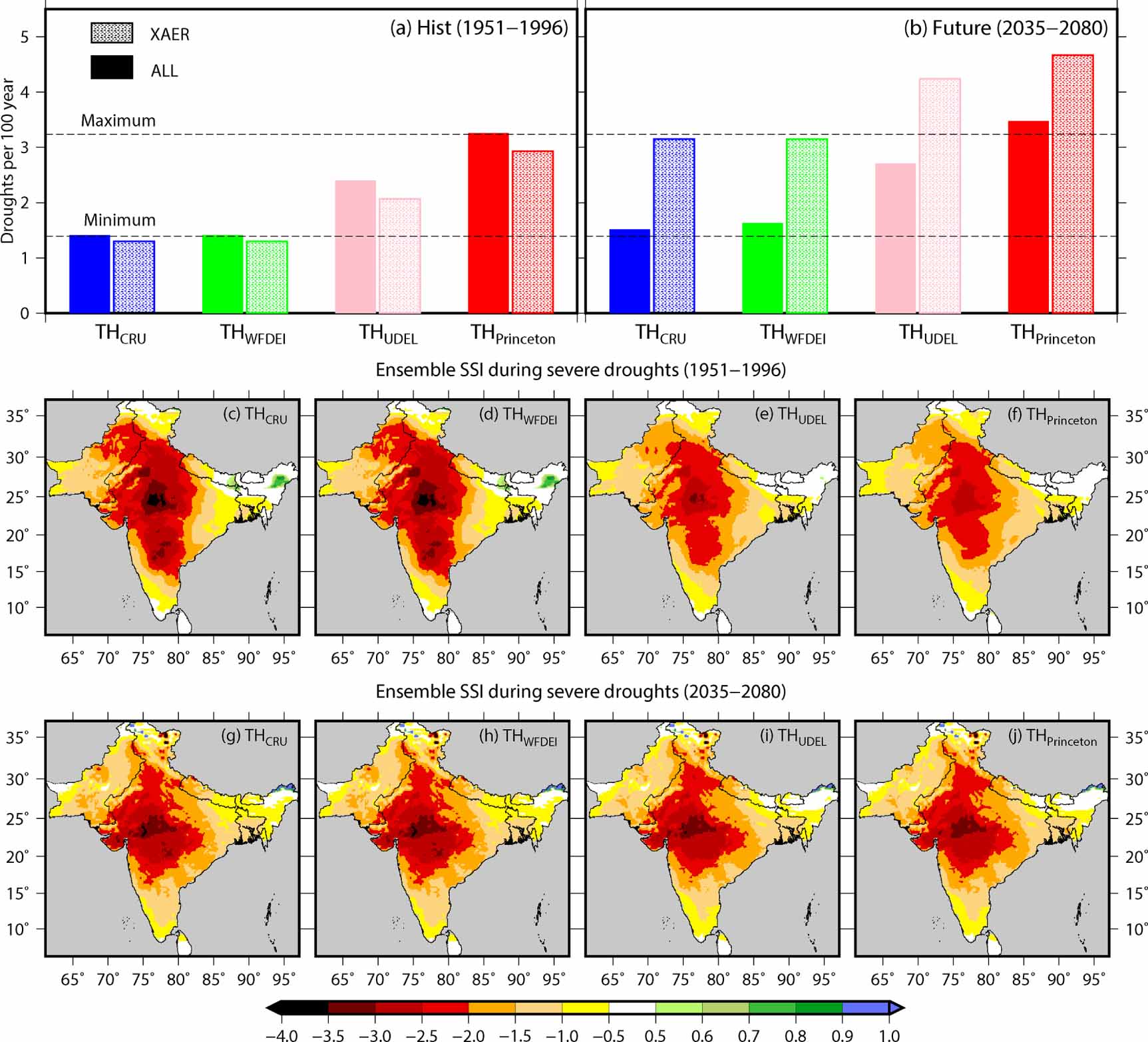 Figure 4. The occurrence of the worst droughts during the fixed industrial aerosol (XAER) condition. (a) and (b) Frequency (per 100 year) of the worst drought (overall severity more than the year 2002 drought) during the ALL and XAER scenarios for the historical (1951–1996) and future (2035–2080) using 20-members of CESM-LENS data. The frequency was estimated using the number of worst droughts that occurred in the selected period divided by the total number of years in the period in 20-members of CESM-LENS. (c)–(j) The ensemble mean of 1 month SSI for severe drought occurred during the (c)–(f) period 1951–1996 and (g)–(j) 2035–2080. The droughts, which have severity more than the 2002 drought in CRU, WFDEI, UDEL, and Princeton, are considered as the worst droughts.