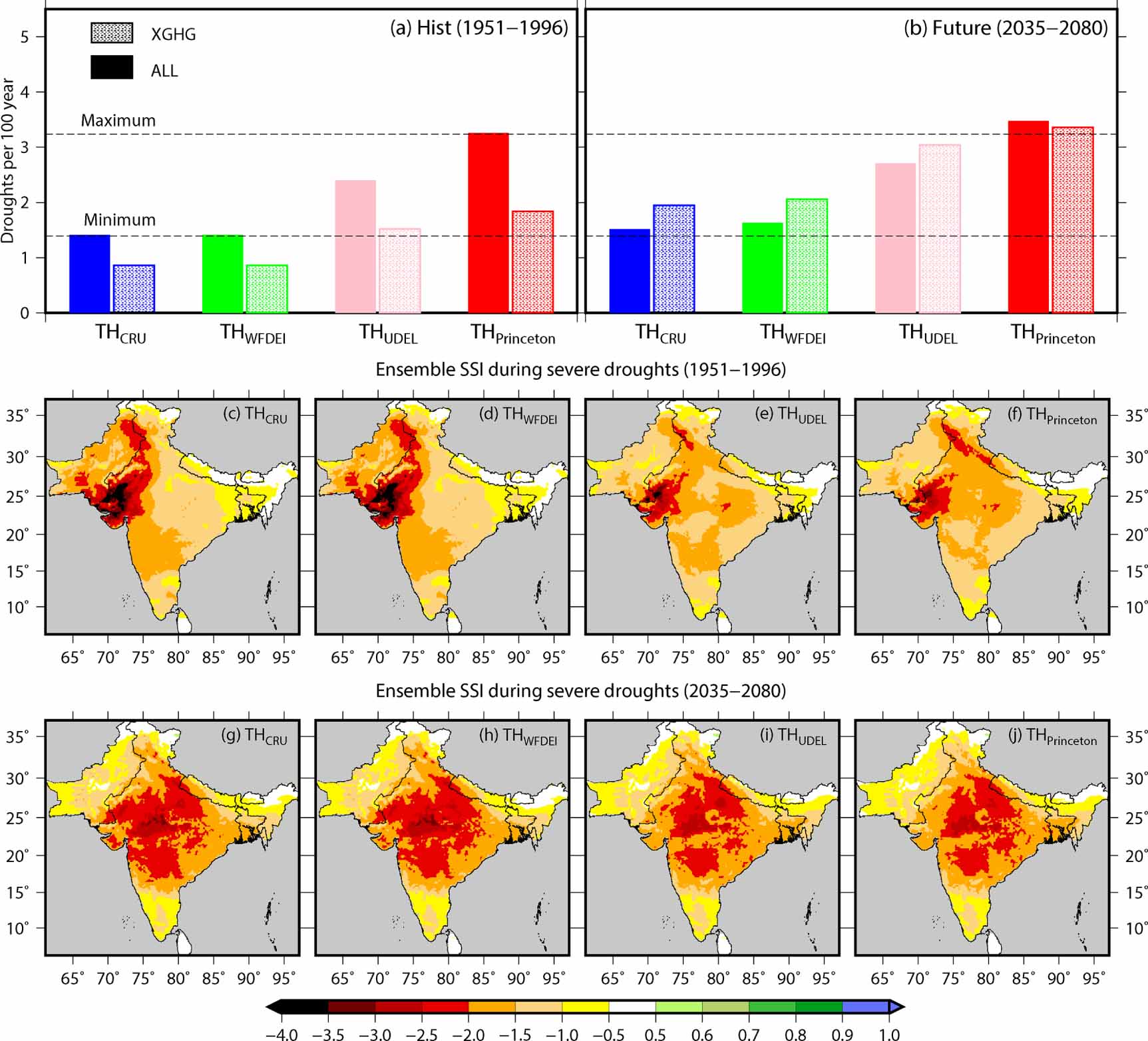Figure 5. The occurrence of the worst droughts during the fixed greenhouse gas emission (XGHG) condition. (a), (b) The frequency of occurrence of the worst drought (overall severity more than the year 2002 drought) during the ALL and XGHG scenarios for the historical (1951–1996) and future (2035–2080) periods using 20-members of CESM-LENS. The frequency was estimated using the number of worst droughts that occurred in a period divided by the total number of years in the period in 20-members of CESM-LENS. (c)–(j) The ensemble mean of 1 month SSI for the worst drought occurred during the (c)–(f) period 1951–1996 and (g)–(j) 2035–2080. The droughts, which have severity more than the 2002 drought in CRU, WFDEI, UDEL, and Princeton, are considered as the worst droughts.