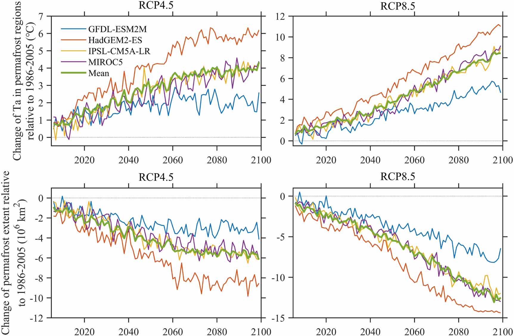 All the four GCMs predicted a consistent warming during the 21st century under the two RCP scenarios (figure 2). The change of permafrost distribution is closely related to Ta changes. Under the RCP 4.5 scenario, when warming slows down after about 2070 for the IPSL-CM5A-LR and MIROC5 models, the decreasing in permafrost area would also decelerate. While under the RCP 8.5, persistent warming would lead to permafrost thaw continually. Among different models under the same RCP (figure 2), stronger warming would normally result in larger permafrost extent decrease, and vice versa.