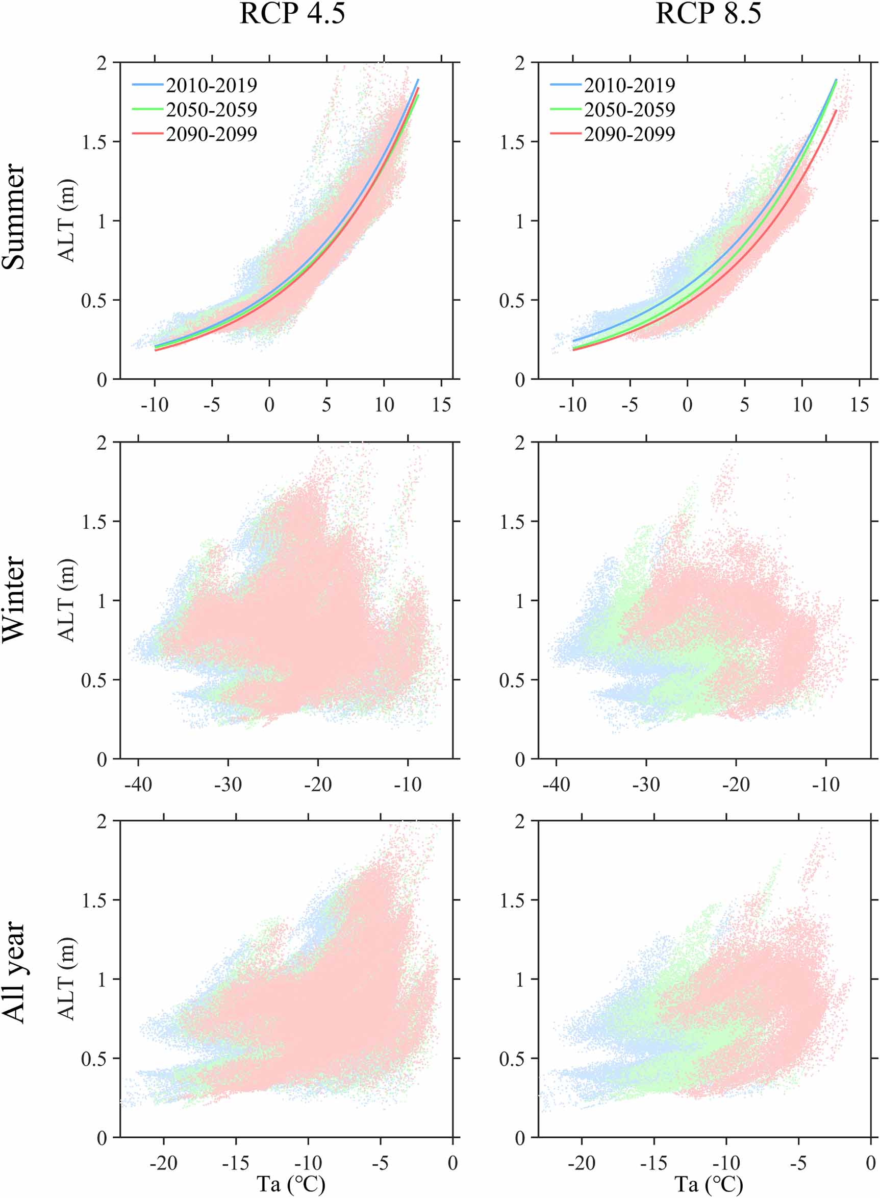 Figure 4. Scatter plot of ALT against mean annual, summer (May–October), and winter (November–April in the next year) Ta of all Northern Hemisphere permafrost grids during the three periods of 2010–2019, 2050–2059, and 2090–2099 under the RCP 4.5 and RCP 8.5, respectively.