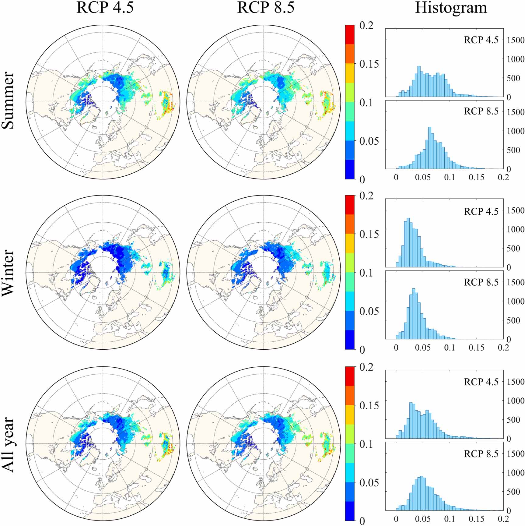 Figure 5. Distribution and histogram of PSCW (m °C−1) based on mean annual, summer, and winter Ta in the 21st century under the RCP 4.5 and RCP 8.5 scenarios.