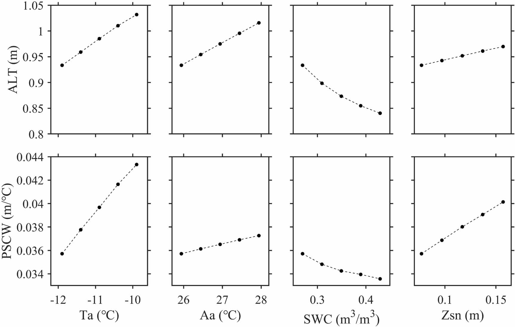 Figure 6. Sensitivity study of ALT (m) and PSCW (m °C−1) for a representative permafrost region in Siberia (60°–75° N, 120°–150° E). The first dot (from left to right) in each panel is the calculated ALT or PSCW from original RCP 4.5 data. The dots (from left to right) after the first one was calculated from gradually increased Ta (°C), Aa (°C), SWC (m3 m−3), or Zsn (m), respectively. Ta and Aa increase by 0.5 °C at each step; SWC increase by 0.02 at each step; and Zsn increase by 0.04 m at each step.