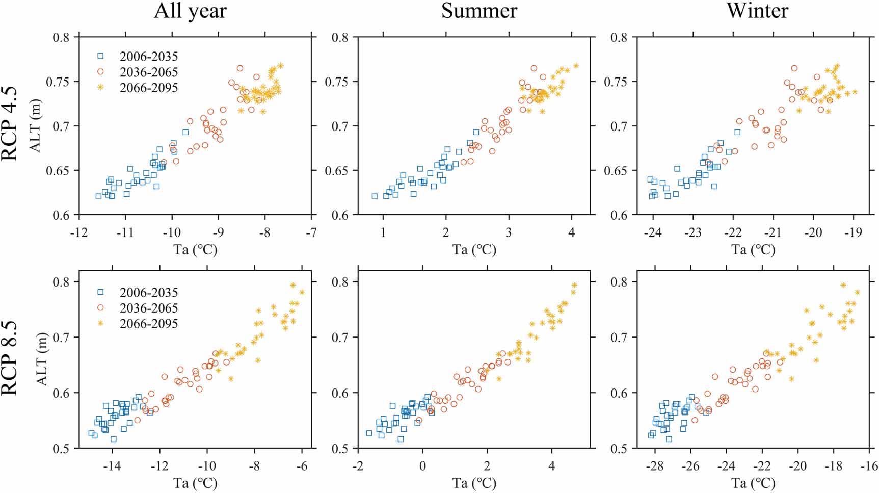 Figure 7. Relationship between mean ALT and mean annual, summer and winter Ta in three 30 year periods under the RCP4.5 and RCP 8.5, respectively.