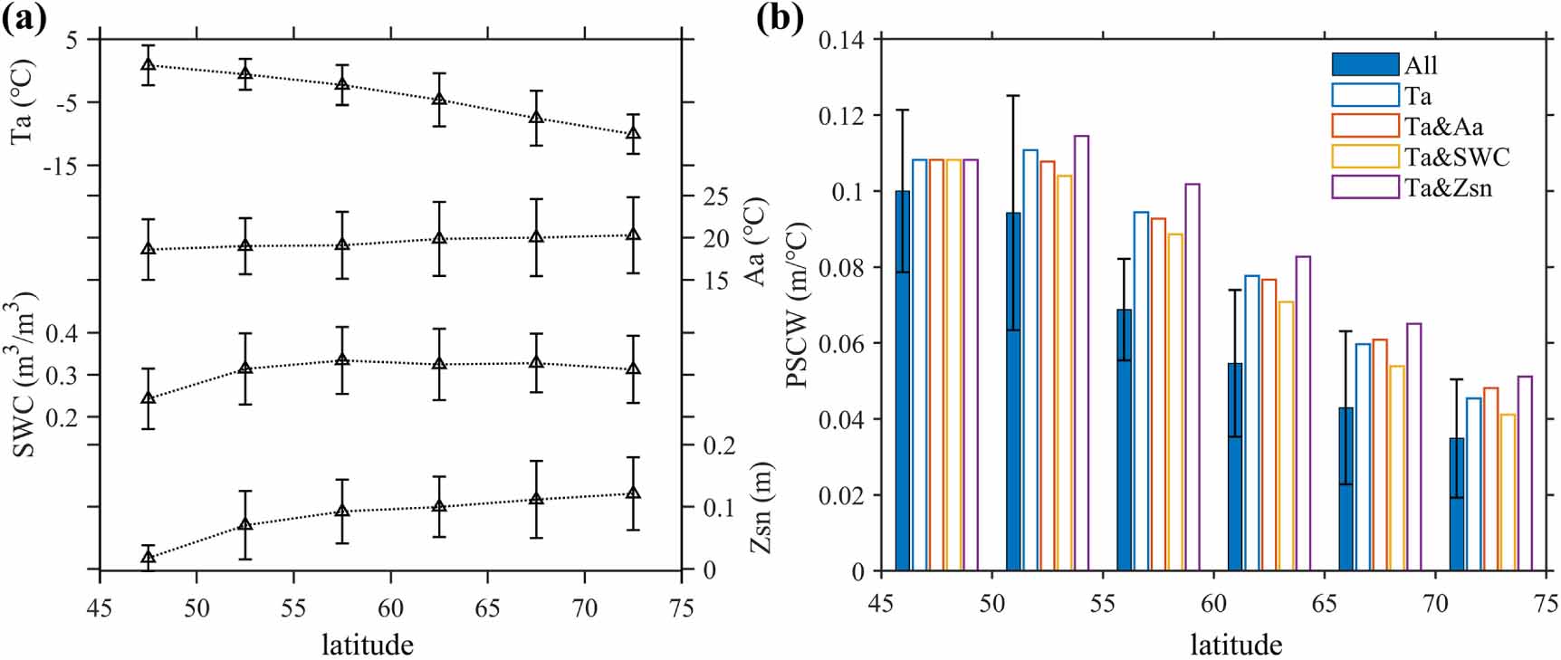 In order to find out whether the spatial variation of Aa, SWC and Zsn would strengthen or weaken the effects of Ta on PSCW, we let one of the three variables (Aa, SWC and Zsn) change with Ta along altitude, but keep the other two equal to their mean values between latitudes 45° and 50° N. Figure 8 shows that when Ta and Zsn change together, PSCW is noticeably larger than that when Ta changes alone. This result demonstrates that Zsn would promote the influence of Ta on PSCW. However, SWC tends to have an opposite effect. Increased SWC in high latitudes tends to weaken ALT temperature sensitivity. Aa increases slightly with latitude and has weak regulation on the influence of Ta on PSCW.