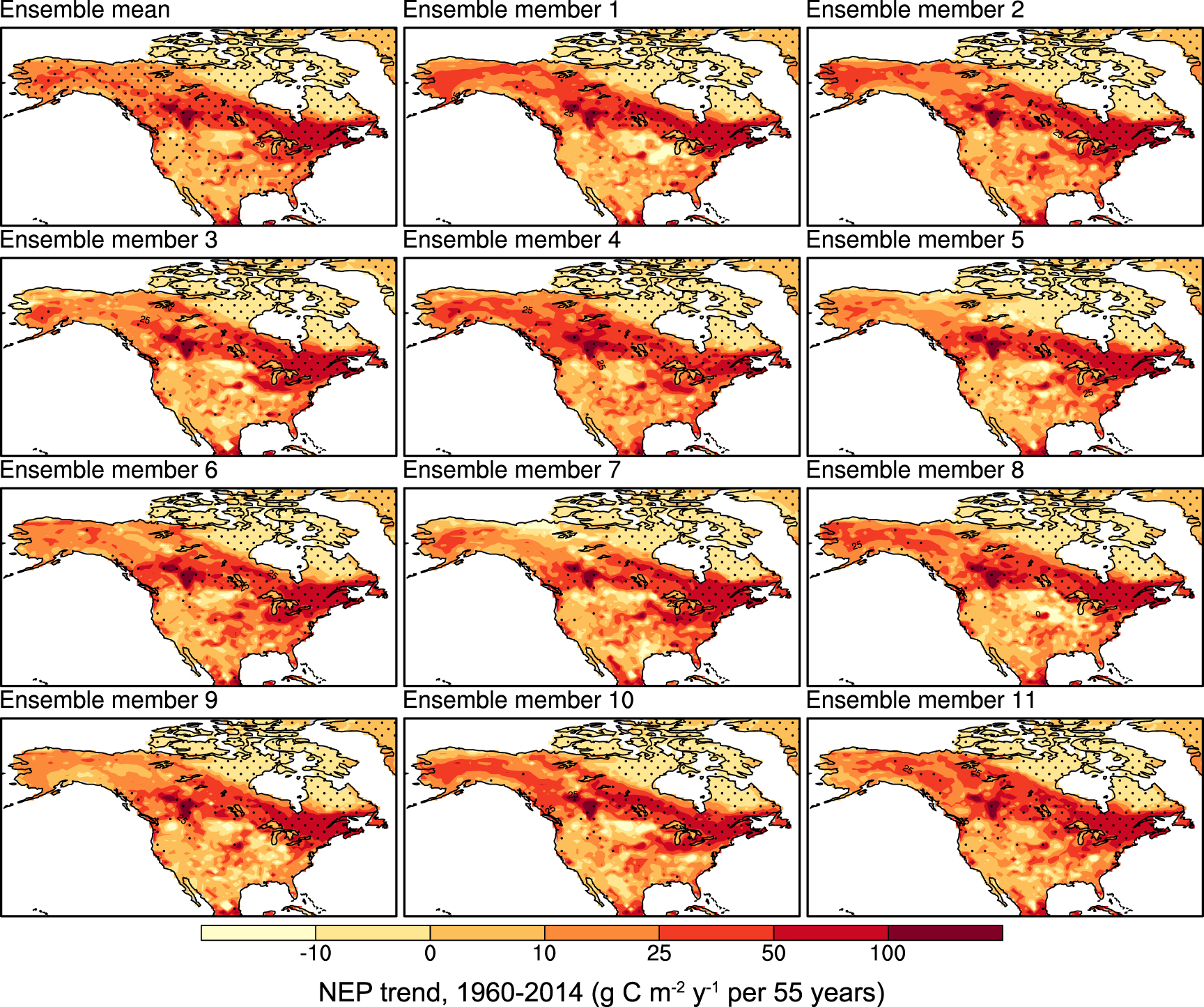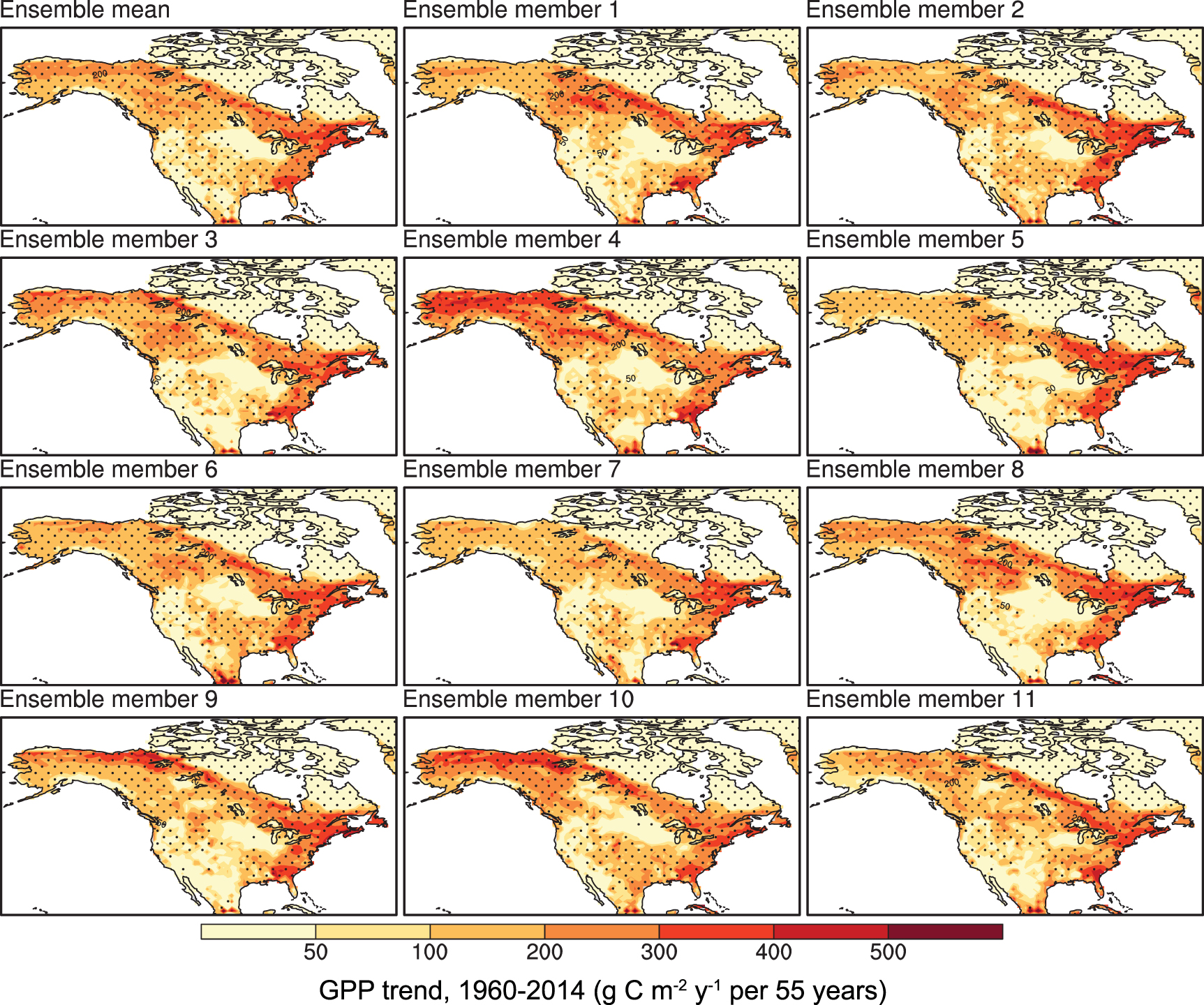 The ensemble mean time series has a statistically significant increase in annual GPP throughout much of North America between 1960 and 2014 (figure 1). Annual GPP increases by 200–300 g C m–2 yr–1 or more over the 55 year period throughout portions of Alaska, Canada, and the eastern US. Portions of the central and western US have a smaller increase in GPP. The magnitude of the trend varies among ensemble members, most prominently in Alaska and western Canada with some ensemble members having a small GPP increase (e.g. members 5 and 7) and others having a large increase in the same region (e.g. members 4 and 10).