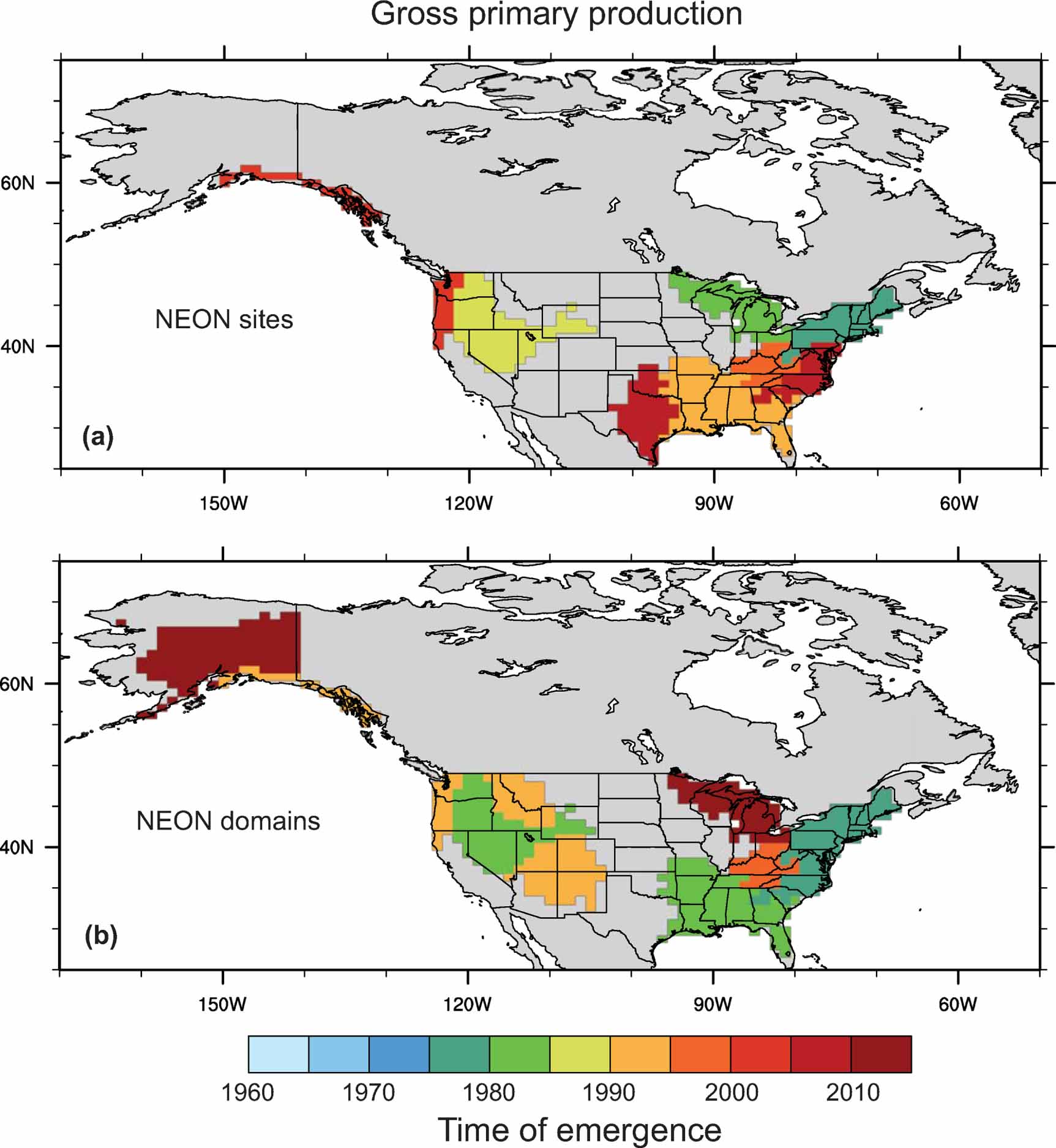 Figure 4. Time of emergence of the forced signal in annual gross primary production (GPP) over the period 1960–2014 for 18 NEON ecolimatic regions at (a) the site scale and (b) the domain scale.
