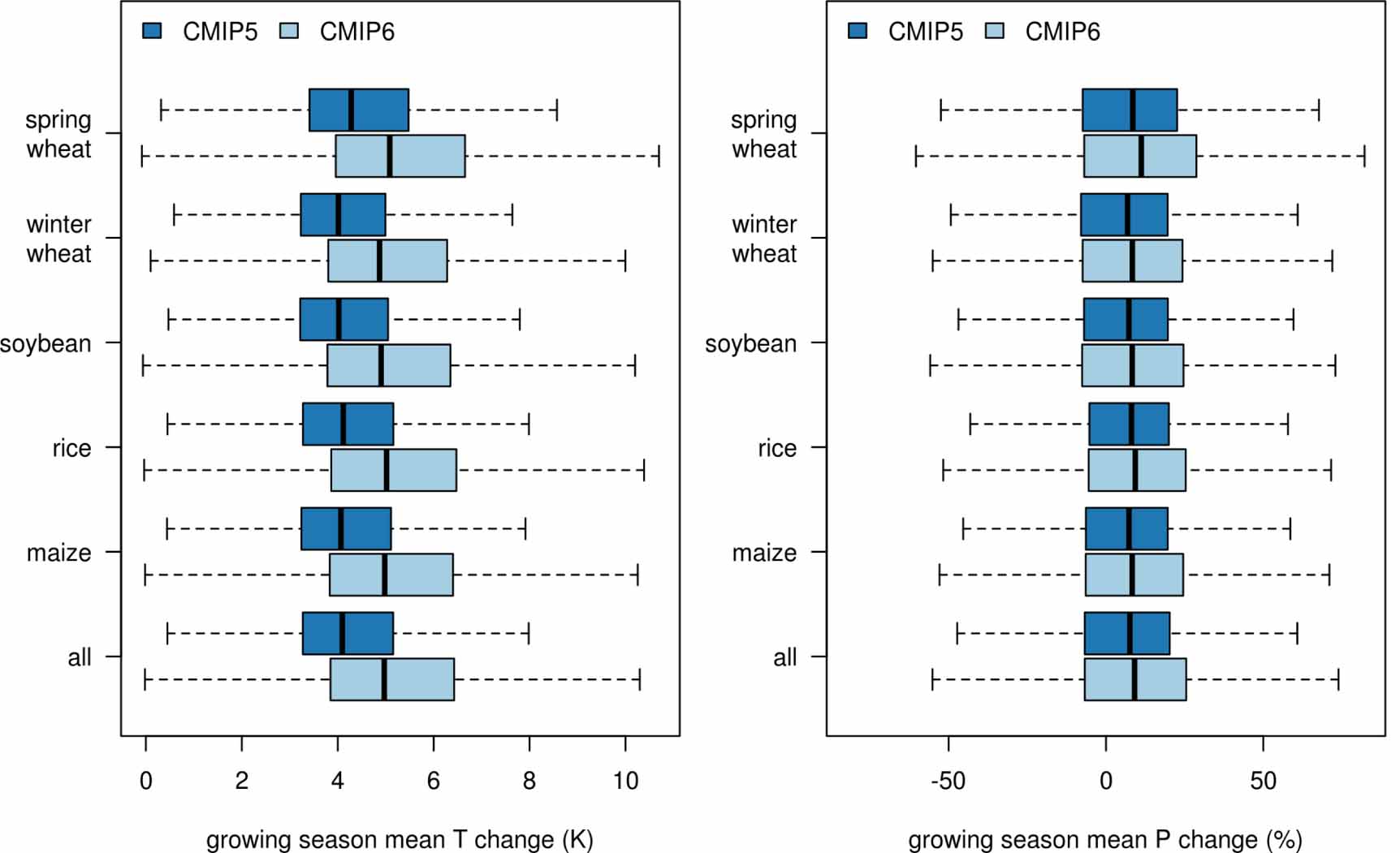 Figure 1. Harvested-area weighted distribution of projected changes in crop-specific mean growing season temperatures (left) and precipitation sum (right) for the CMIP5 and the CMIP6 ensemble under RCP8.5 at the end of the 21st century (2069–2099). Colored boxes show the 25th to 75th percentile of the distribution and the thick black lines show the median. Whiskers extend to the maximum value within 1.5 times the interquartile range beyond the 25th and 75th percentile respectively. Outliers, i.e. values outside this range are not shown. Growing seasons are held constant across historical and future time periods. Figures for RCP4.5 and RCP2.6 are shown in the appendix, but show a similar pattern: warmer average conditions in CMIP6 and larger spread across the ensemble than in CMIP5.