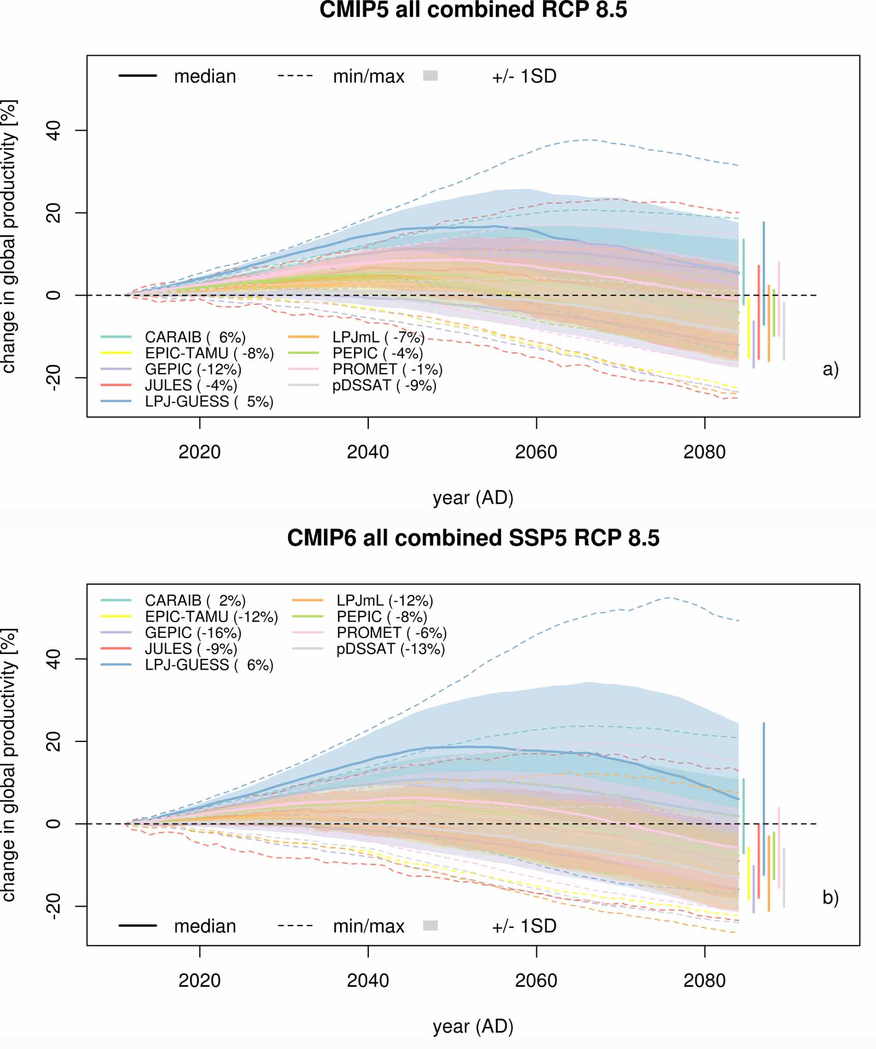 Figure 2. Time series of projected impacts aggregated across the major five crops per crop model for RCP8.5. Thick lines show the median, dashed lines the minimum and maximum across all CMIP5 GCMs (panel (a)) and all CMIP6 GCMs (panel (b)), shaded areas represent ± one standard deviation around the median. For better visibility, the range of ±1 SD per GGCM at the end of the 21st century is depicted as colored vertical lines and the median value in the last time slice (2069–2099) is given in parenthesis next to each GGCM's name.