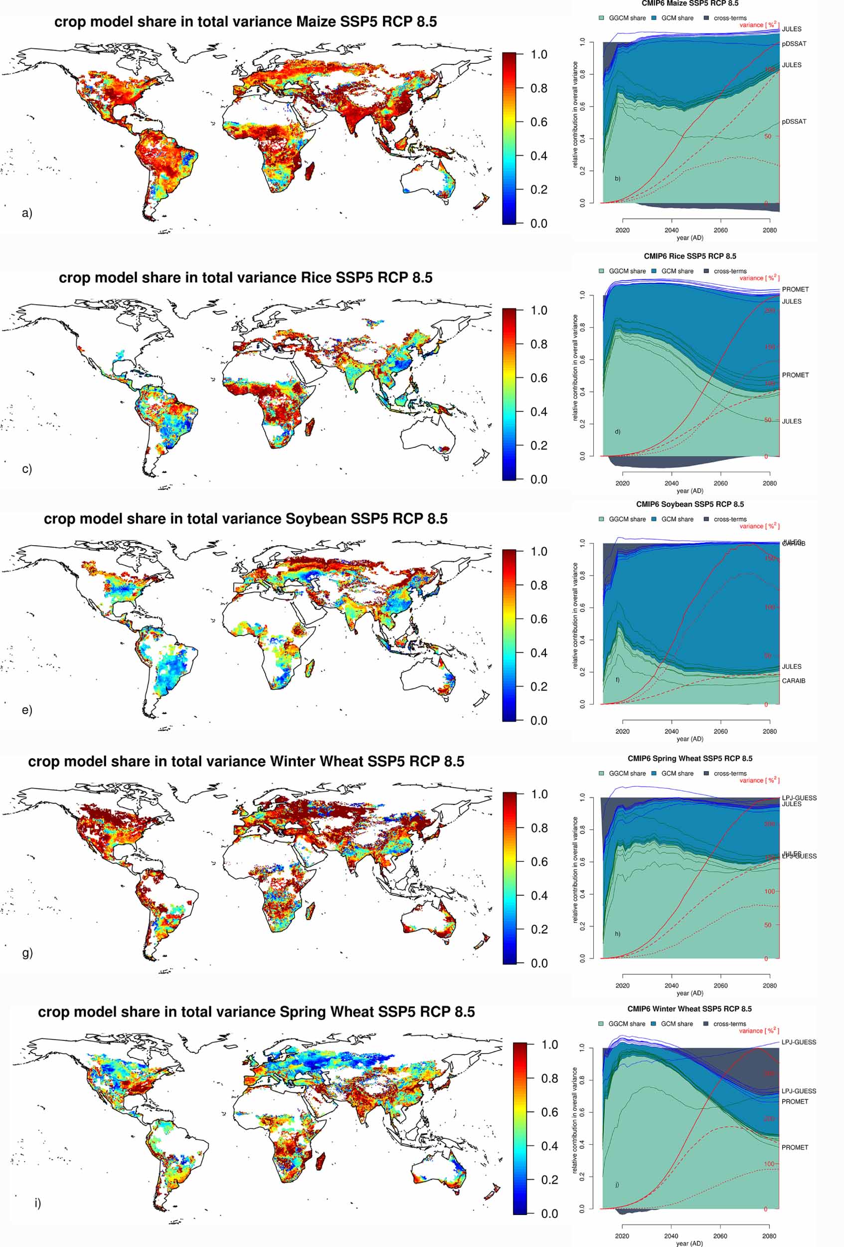 Figure 7. Crop-specific variance attribution for CMIP6 and RCP8.5 only. Right column (panels (b), (d), (f), (h), (j)) shows changes in GCM and GGCM induced variance shares (colored areas) as well as the sensitivity of these shares to exclusion of individual GGCMs from the ensemble (thin lines), the most sensitive ensemble members are labeled. Red lines indicate absolute variance of the total ensemble (solid), the GGCM share (dashed) and the GCM share (dotted). Scales for variance are adjusted per crop and are thus not directly comparable. Maps in the left column (panels (a), (c), (e), (g), (i)) show the GGCM-induced variance share at the grid cell level in the last time step (2084).