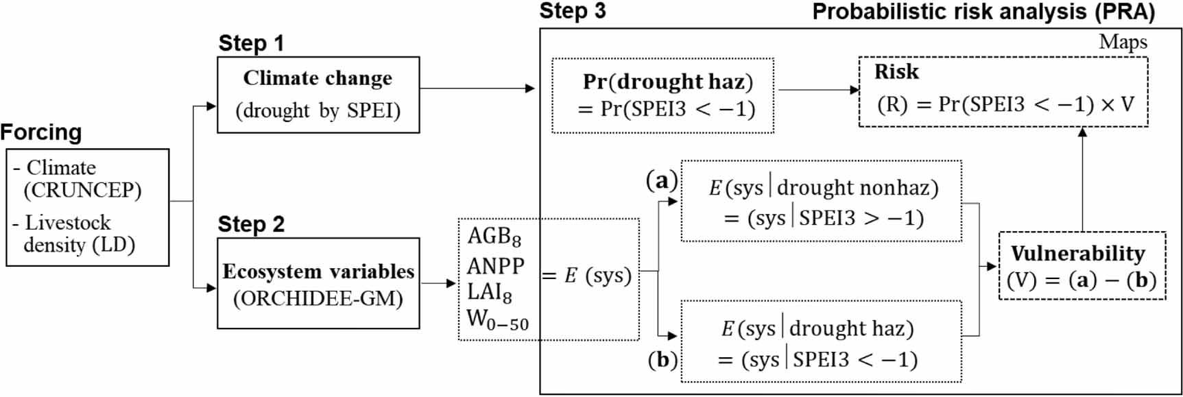 Figure 2. Risk framework: in Step 1, climate change-induced drought conditions calculated by the SPEI model with forcing of CRUNCEP climate data; in Step 2, ecosystem variables in MG (AGB8, ANPP, LAI8, and W0–50) simulated by ORCHIDEE-GM model with forcing of climate CRUNCEP and livestock density (LD) data. Finally, PRAs (Step 3) are performed using outputs of Steps 1 and 2, respectively. The probability of hazardous drought, Pr(drought haz), is defined as SPEI3 <−1.0 and their probability of occurrence. E(sys|drought nonhaz) and E(sys|drought haz) is the expected value of the ecosystem variables when conditions are non-hazardous (SPEI3 >−1.0) and hazardous (SPEI3 <−1.0).