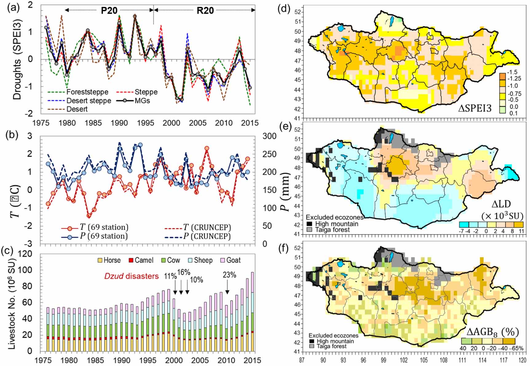 Figure 3. Interannual changes in (a) summer drought (SPEI3 for June–August) with P20 and R20, (b) climate (annual T and P), and (c) livestock number per each species in sheep units (SU) during 1976–2015. Spatial patterns of differences (Δ) between two composites (R20 and P20) of (d) SPEI3, (e) LD in SU, and (f) the modeled AGB8 (in relative terms, %). The (Δ) for SPEI3 and LD (AGB8) calculated as the absolute (relative) values in means between R20 and P20. In (c), black arrows indicate dzud disasters (livestock losses) in 2000–2002 and 2010, respectively.