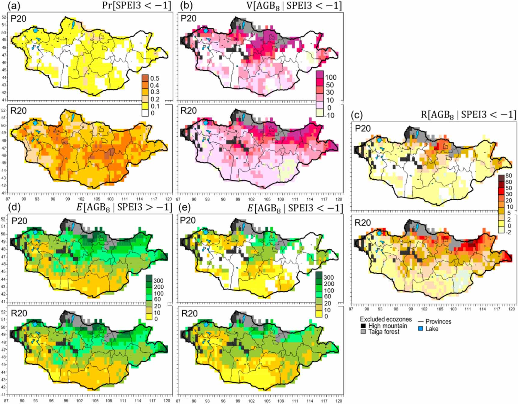 (figure 4(a)), the vulnerabilities of AGB8 (figure 4(b)), and resulting risks (figure 4(c)) with mean values of AGB8 under non-hazardous years (SPEI3 >−1.0) (figure 4(d)) and hazardous ones (SPEI3 <−1.0) (figure 4(e)). In figure 4, the blanked areas indicate areas are without hazardous (moderate to severe) or favorable climate conditions in P20, and these areas are excluded in the vulnerability and risk analyses. For both periods, hazardous droughts caused a lower AGB8 (figure 4(e)). Regionally, vulnerabilities and risks of AGB8 increased from the south to the north (figures 4(b) and (c)). During P20,