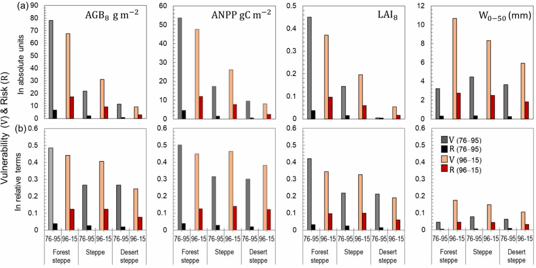 Figure 5. Drought risks and vulnerbalites for AGB8, ANPP, LAI8, and W0–50 for each period (P20: 1976–1995 and R20: 1996–2015) for three main ecozones of MG. The V and R are expressed in absolute (a) and relative (b) terms in averaged values over all grid cells for each ecozone. Relative terms (b) are estimated as fractions of variables under non-hazardous conditions in each grid cell.
