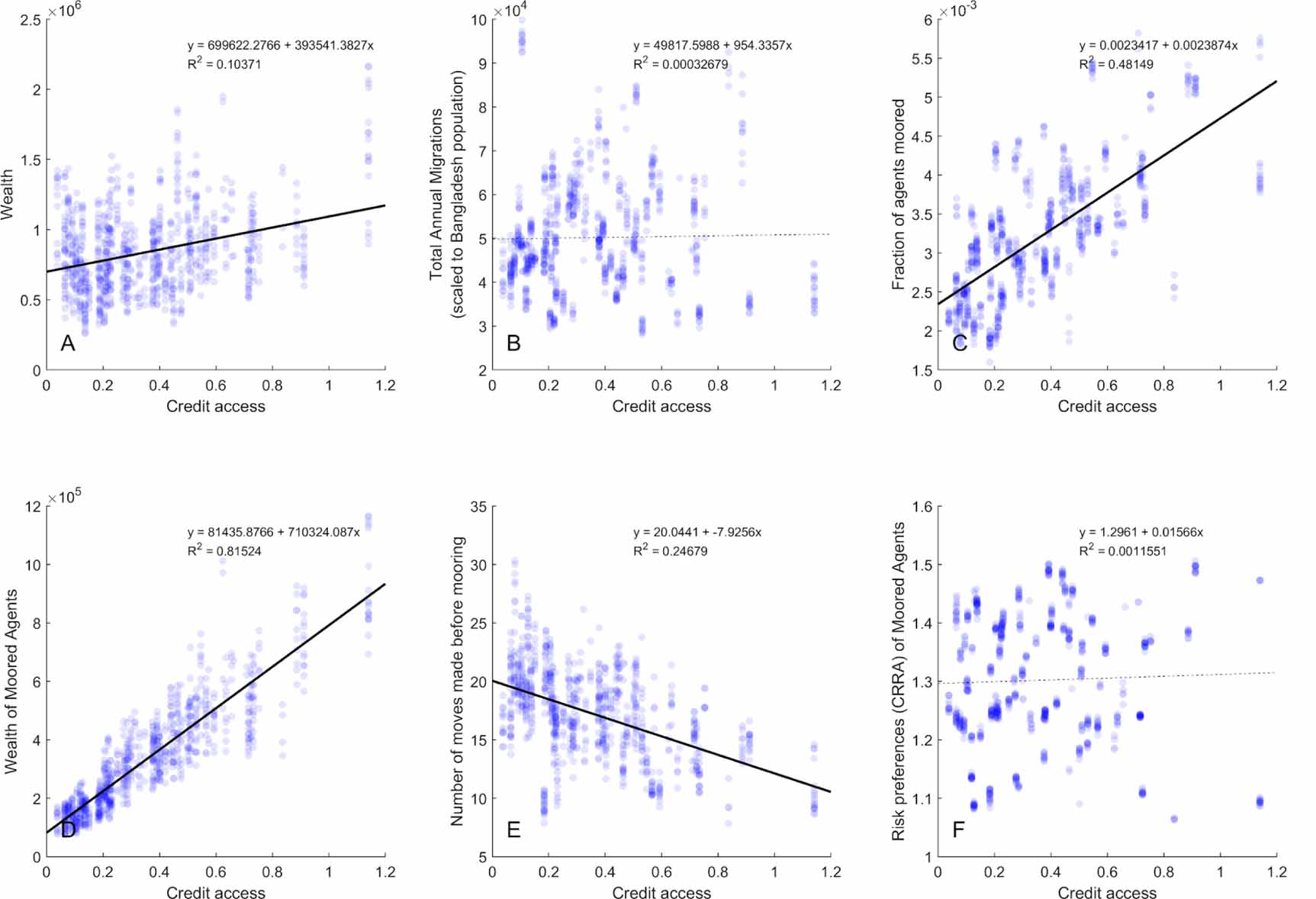 Figure 3. Top row panels show effects of increasing credit access on overall (A) agent average wealth, (B) total migrations, and (C) those agents unable to find better portfolios of opportunity than they currently have that they can afford. Bottom row panels show effects of increasing credit access on characteristics of those agents identified in panel (C), which we identify as moored: (D) their average wealth, (E) number of moves before becoming 'moored', and (F) their constant relative risk aversion (CRRA). Credit access is a scalar multiple of the amount an agent has spent to gain access to utility layers (analogous to investing in schools, training, or purchasing assets, e.g.), which we use as a proxy for capital. Significant trends with credit access are shown with solid black trendlines; non-significant trends are shown with dashed lines.
