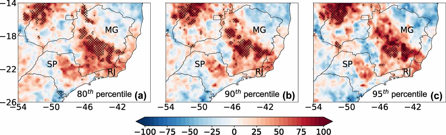 We started by analysing the percent change of CDH events, considering all the summer heatwave episodes with durations above three consecutive days and three different thresholds (80th, 90th, 95th percentiles) (figure 1). During the 1999/00–2017/18 period, concurrences increased substantially (values between 50% and 100%) over the northwestern SEB section, the central and southern areas of MG, and the northeastern section of RJ. This increase is statistically significant over large swaths when compared to the 1980/81–1998/99 period. Positive values were also observed in some areas of SP, however a general absence of statistically significance was evident. All the remaining areas presented near-zero or even negative values, mostly not statistically significant. The spatial variability pattern of the percent change was very similar throughout the considered temperature thresholds.