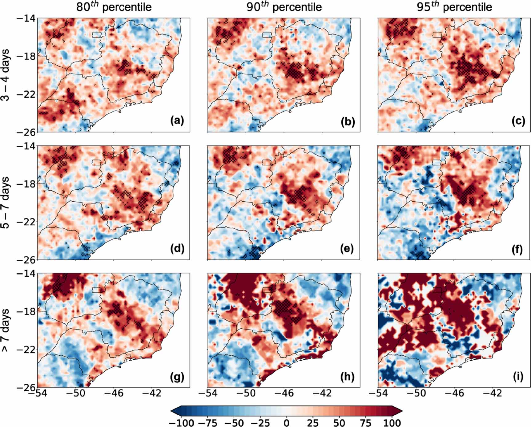 In addition to considering different thresholds we also assessed the percent change for different heatwave durations (figure 2). Despite some slight differences regarding the spatial pattern of percent change values distribution throughout all the combinations of drought and heatwave, in general, severe and long compound events have become more frequent than those short and mild. This is particularly evident for the SEB northwestern section and MG central and southern areas. For compound event durations of 3–4 days (figures 2(a)–(c)), large parts of SEB presented positive and statistically significant (p < 0.05) percent changes, with the highest values in the MG central region. Regarding compound events with a duration of 5–7 days (figures 2(d)–(f)), the pattern was very similar, despite the higher absolute values of percent change. As we consider even longer heatwaves and higher intensity thresholds, the SEB area with negative percent change values also increases, although the values are typically non-statistically significant. Taking into account the longest compound heatwave events (figures 2(g)–(i)), the regions with higher positive and statistically significant values were located within MG, which is in fact, the only SEB area that presented a robust and consistent pattern of positive % change throughout all the combinations of severity and duration of compound heatwaves. Regions such as the coastal section of RJ and some interior land parts of SP also presented positive changes close to 100%. However, the interpretation of these results requires a careful consideration due to their lack of statistical significance.