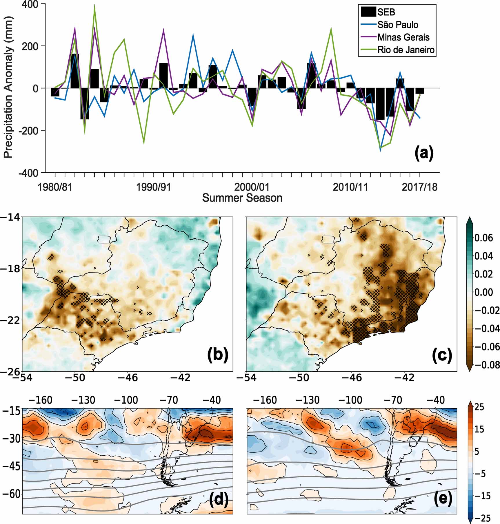 Standard image High-resolution imageFor MG and RJ, the lowest (highest) recorded precipitation anomaly (percentage of concurrence) was observed during the 2014/15 summer season. Despite this, the precipitation anomaly values were not so different compared to 2013/14. By contrast, soil moisture anomalies (figure 4(c)) were much stronger and widespread in MG and RJ when compared to the 2013/14 season (figure 4(b)). This difference reflects the fact that during the period between the 2013/14 and 2014/15 summer seasons, pronounced precipitation deficits were maintained, particularly for MG and RJ [49]. Consequently, the soil moisture values continued to decrease at a faster rate in these two states, compared to SP. Secondly, the synoptic atmospheric circulation pattern in MG and RJ, contrary to SP, induced clear sky conditions and strong diabatic heating, leveraging initially high evaporation rates (until soil dry-out) and the occurrence of several heatwave periods, and, consequently, compound events. During the 2014/15 season the predominant atmospheric blocking pattern (figure 4(e)) moved northeast, affecting a broader area in RJ and MG when compared to the 2013/14 season (figure 4(d)). Consequently, clear sky conditions were predominant over these two states, offering the ideal conditions (radiative forcing and diabatic heating) for boosting the development of heatwaves over RJ and MG, rather than over SP (figure S1). Analysing the isohypses at 500 hpa during the 2014/15 summer season (figure 4(e)), it is possible to observe a well-defined wave pattern of the mid-atmosphere circulation spanning from the central south Pacific Ocean to the western South Atlantic Ocean and to the vicinities of south and southeastern coast of Brazil. This ridge-trough sequence was a clear signature of a large-scale teleconnection wave train that was also identified (although with less intensity) during 2013/14 (figure 4(d)). This Rossby wave train was induced by an equatorial Pacific heat source north of Australia [31].