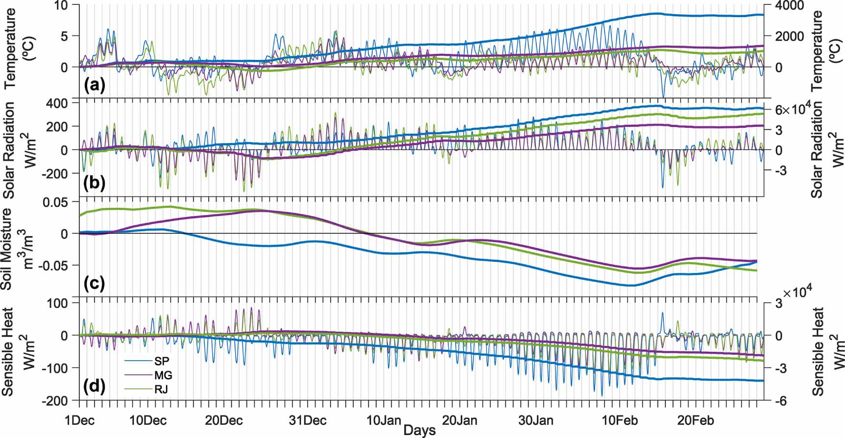 Figure 5. Anomalies (left y-axis) from 1st December of 2013 to 28th February of 2014, of (a) surface 2m temperature (at a hourly scale), (b) surface net solar radiation (at a hourly scale), (c) soil moisture (at a daily scale) and (d) surface sensible heat flux (at a hourly scale) for SP (blue line), MG (purple line) and RJ (green line). The respective colored bold lines represent the accumulated values of each variable since 1st December (right y-axis).
