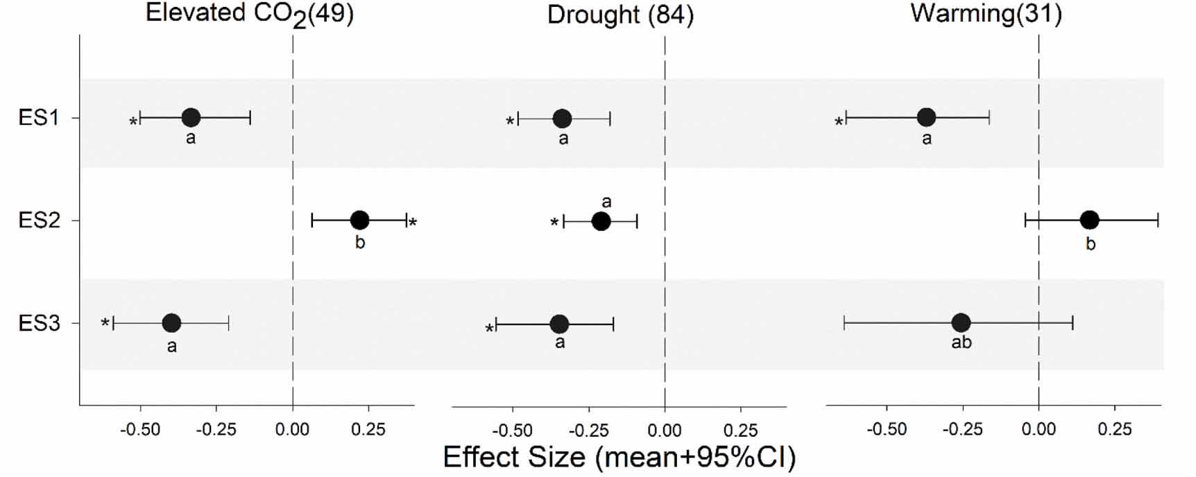 Figure 2. Effect size (ES) estimates comparing crop performance under current environment conditions and without weeds (control) with weeds (ES1), with environmental change (ES2), and the effect of weeds under environmental change (ES3). Credible intervals (95%CI) that do not include zero are considered statistically significant (indicated by an asterisk). Within each environmental change factor, different letters indicate that credible intervals are statistically different from each other. Numbers indicate sample sizes. See table S2 for parameter values.